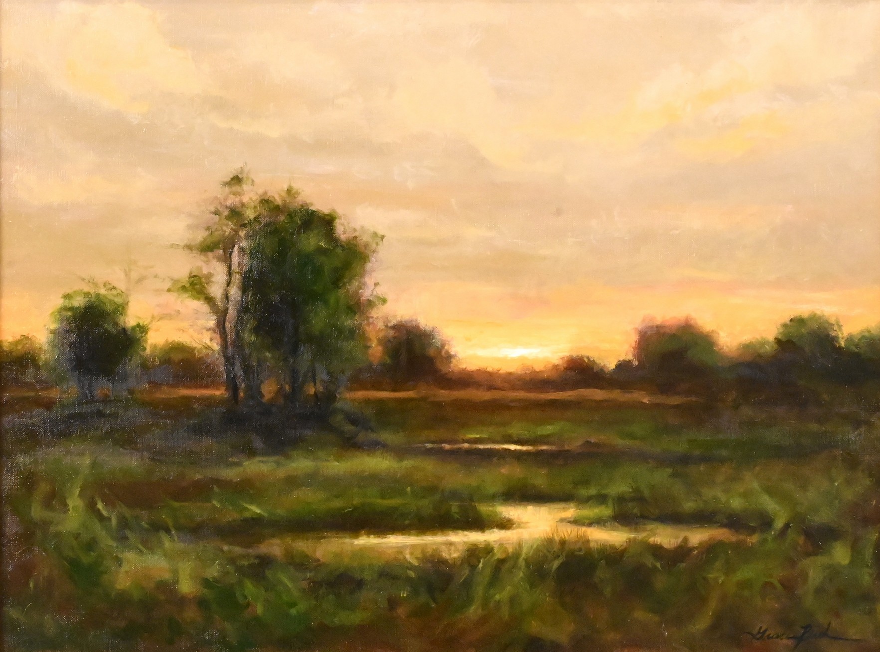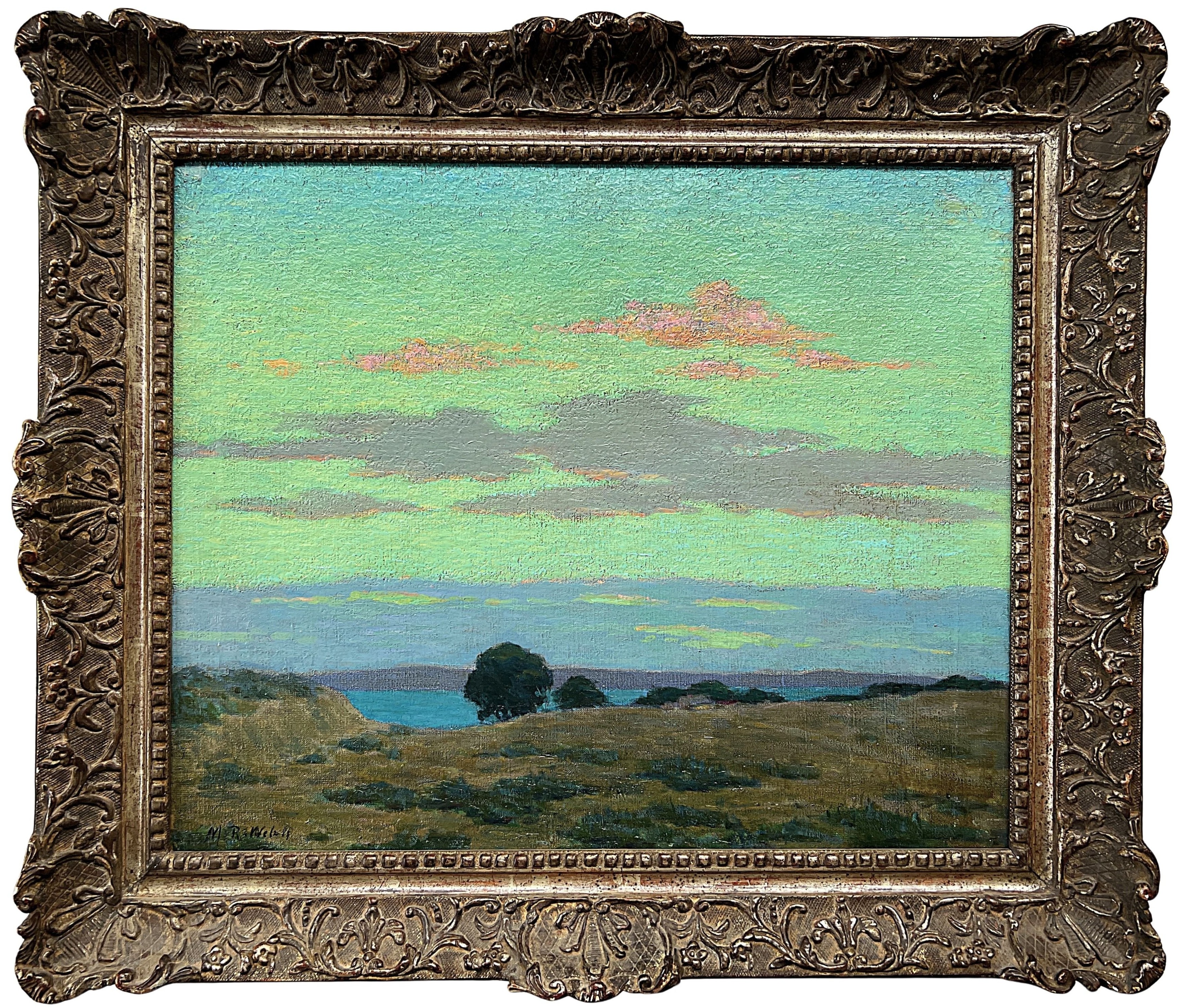 A pastoral landscape with a winding stream and softly luminous sunset sky. The restrained palette and atmospheric handling recall the muted harmonies developed by artists of the New England Old Lyme Art Colony — where painters sought a uniquely American interpretation of the Barbizon and Tonalist traditions rooted in Connecticut’s rural scenery.