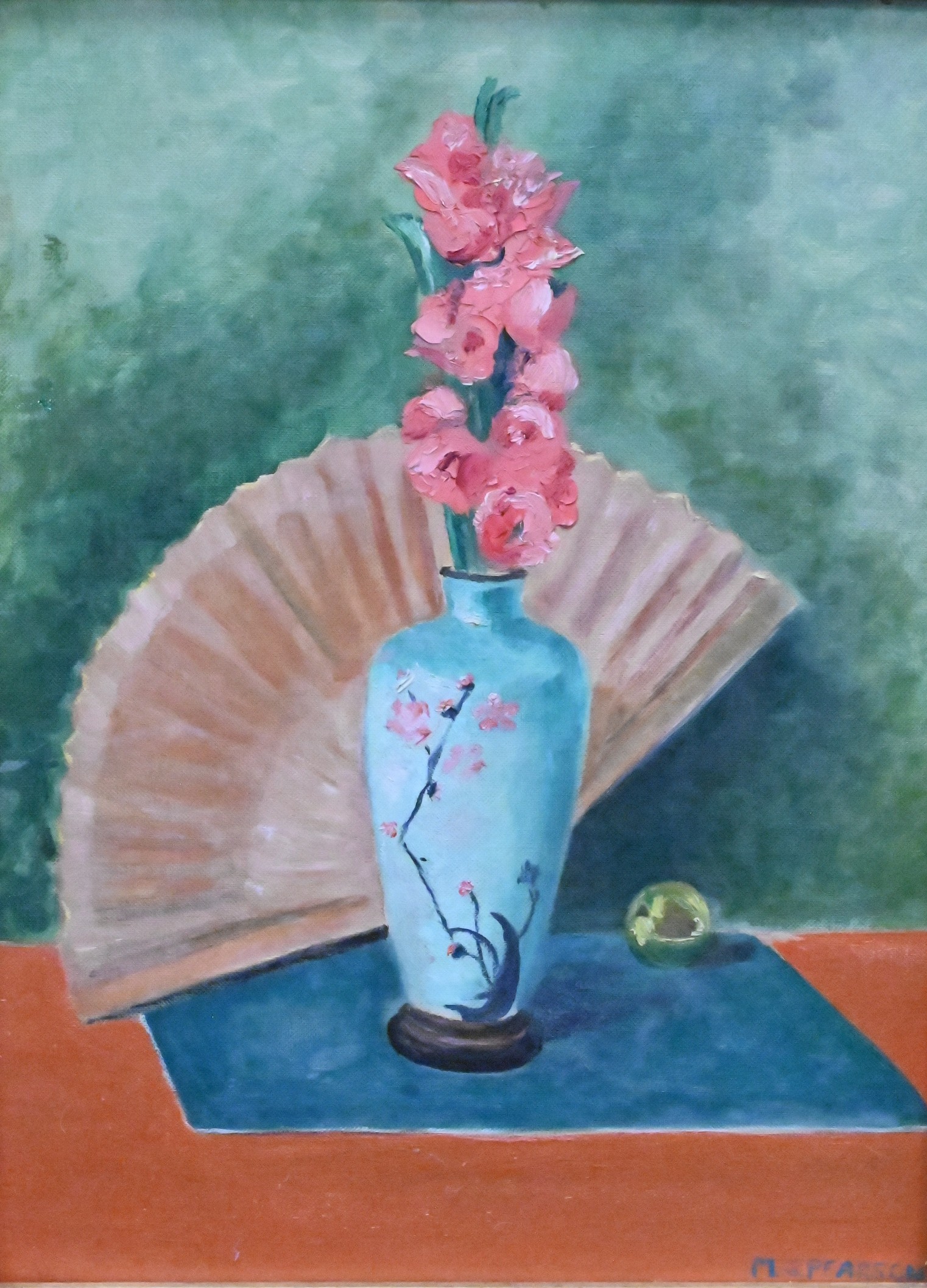 Oriental Still Life with Fan and Flowers in Turquoise Vase