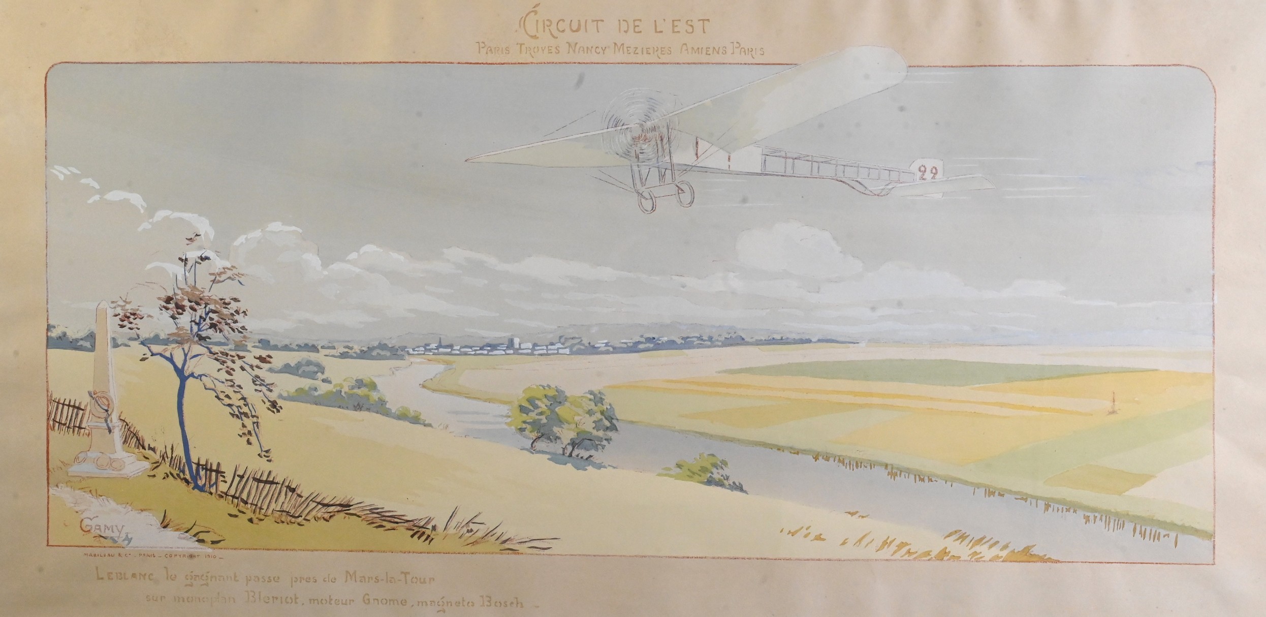 Depicting Alfred Le Blanc, winner of the Eastern Circuit cross-country race, gliding over the fields of Mars-La-Tour in France’s Lorraine region.