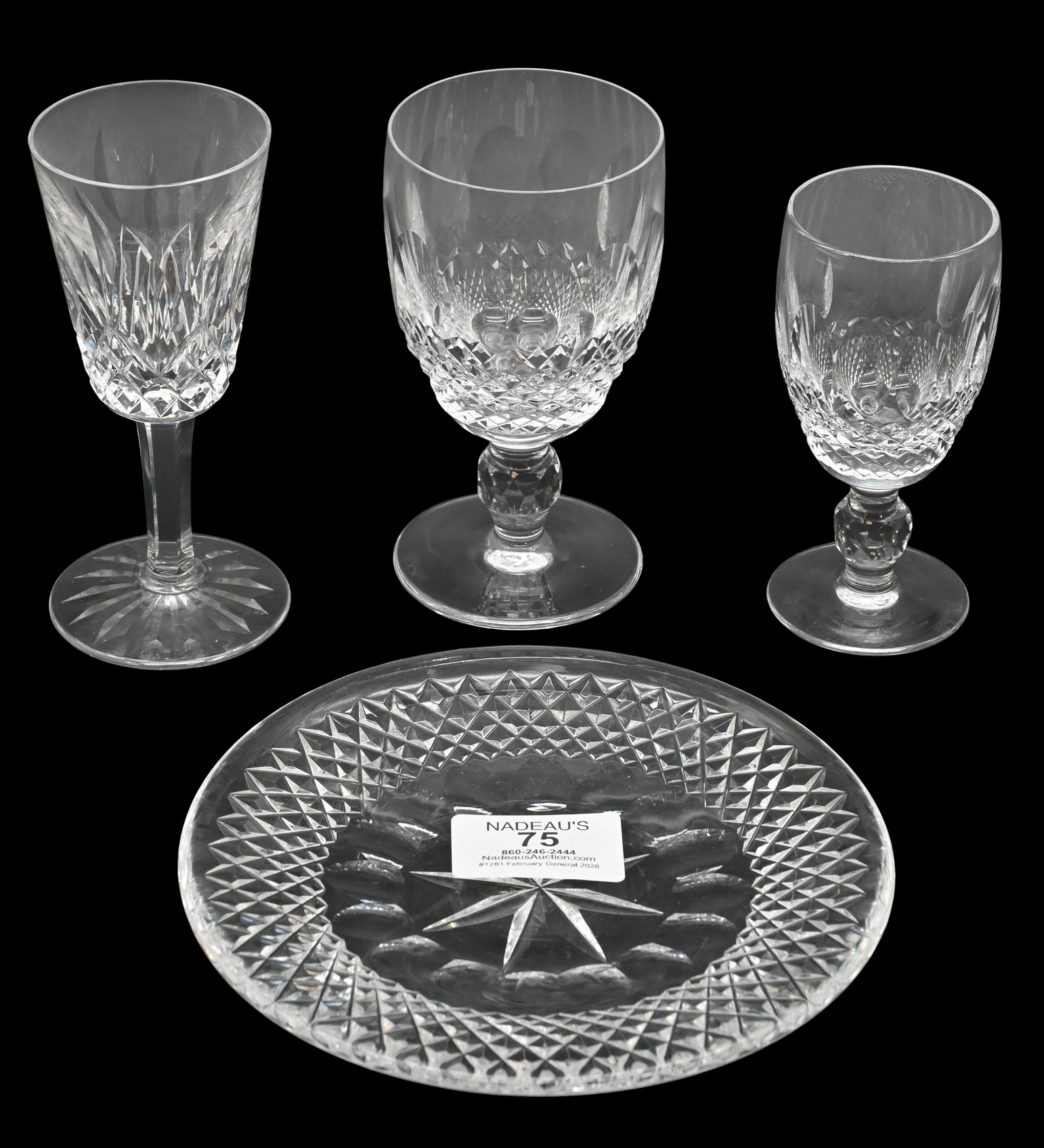 to include 13 “Colleen” short champagnes, 13 “colleen” cordials, 8 “Lismore” sherry glasses, along with 12 dessert plates