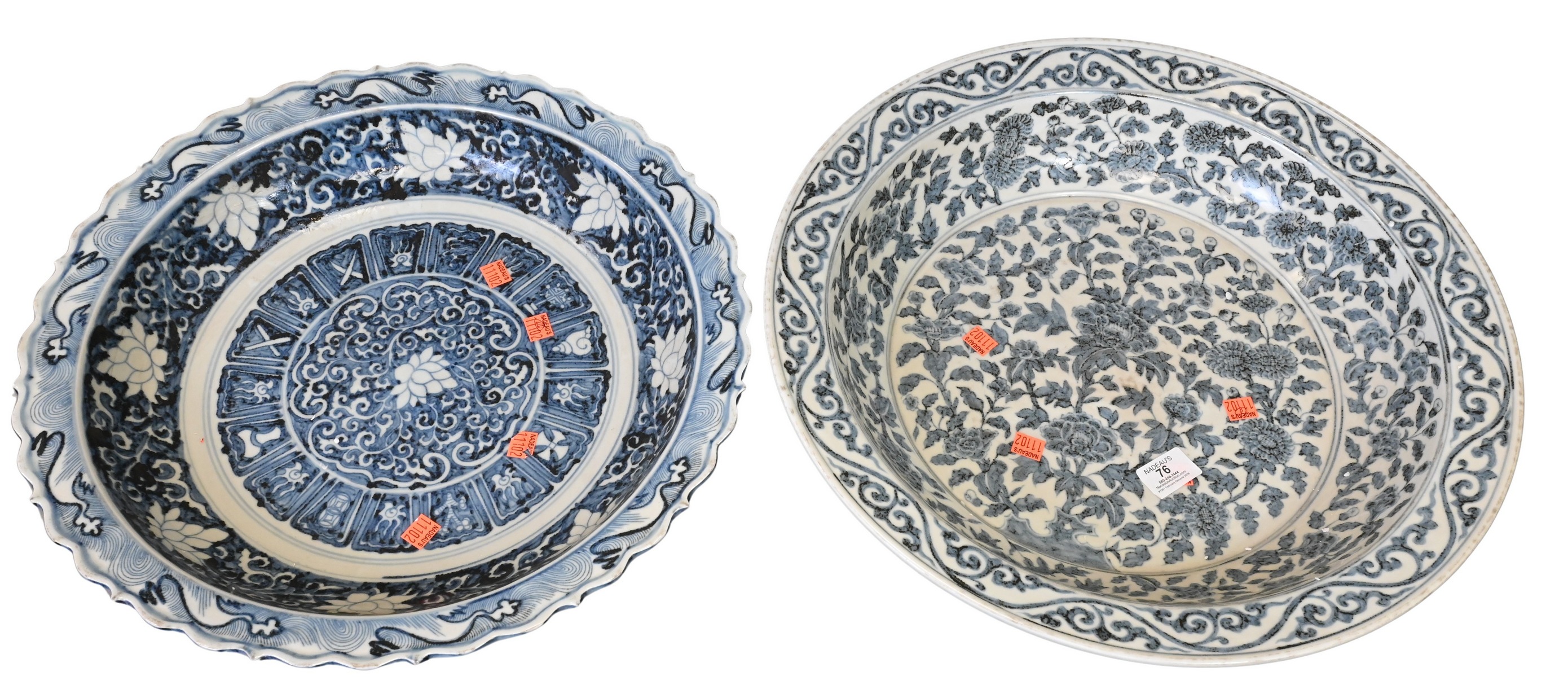 one decorated allover floral and scrolling vine pattern, diameter 18 1/2 inches, the other having lotus and crashing waves motif and shaped rim, diameter 18 inches