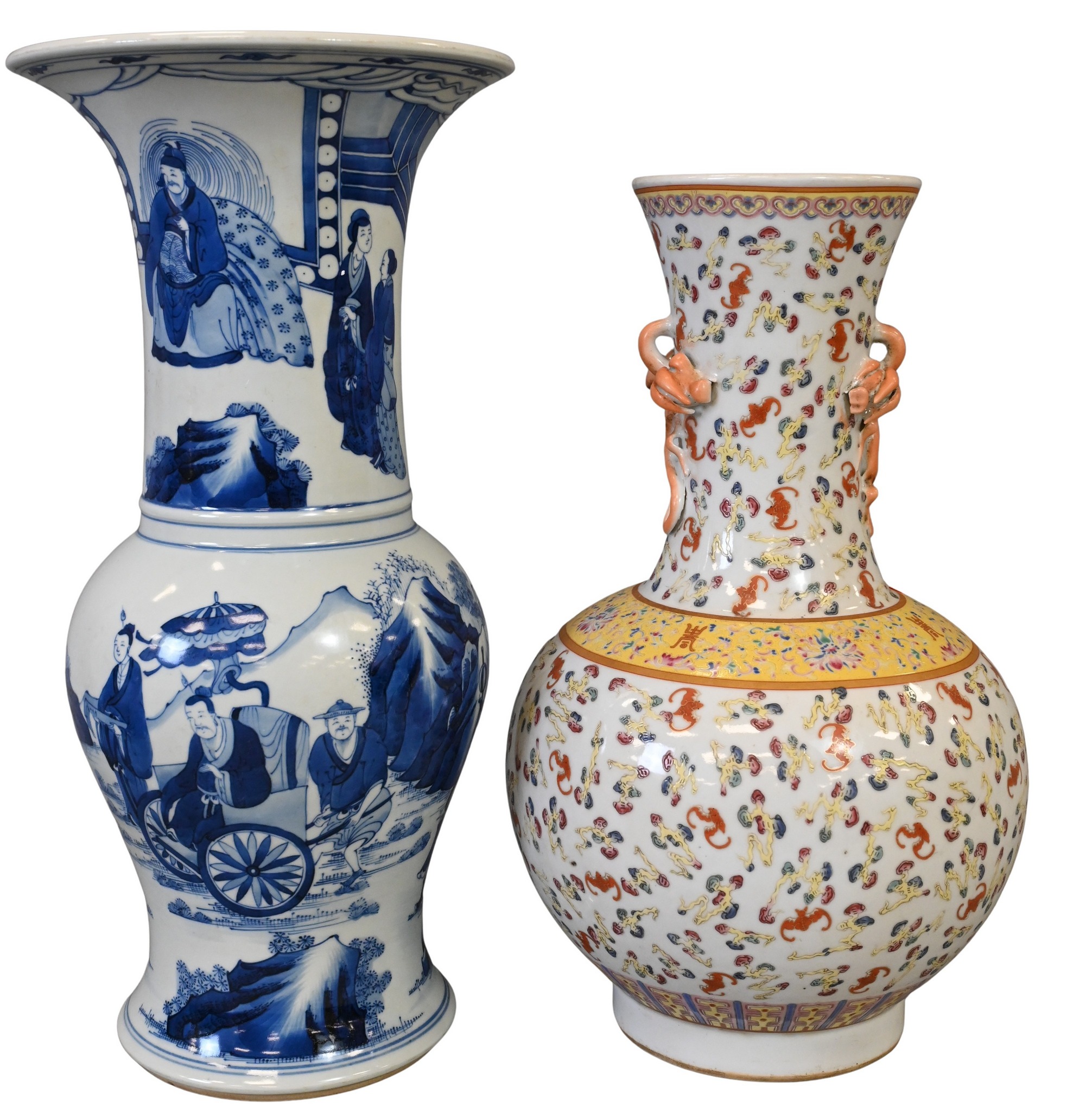 one blue and white Gu form vase having scholars, geishas and warriors in a landscape, height 18 3/4 inches along with family rose vase having bat motif with yellow enamel band and raised double handles, height 17 inches