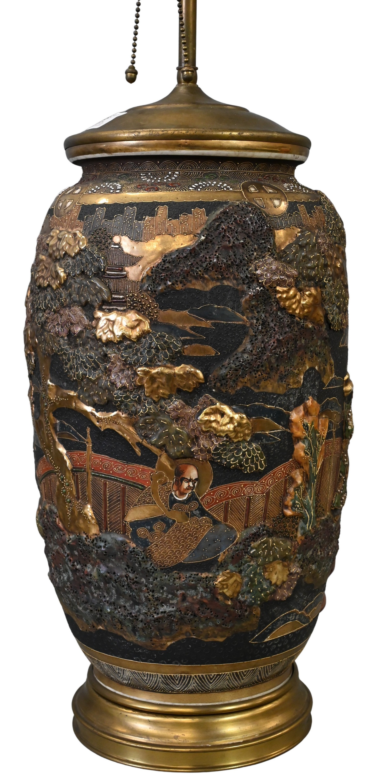 decorated in high relief with a traditional landscape scene, featuring a tree, architectural elements, and seated figures, with gilt and polychrome detailing on a textured ground. Converted to a table lamp