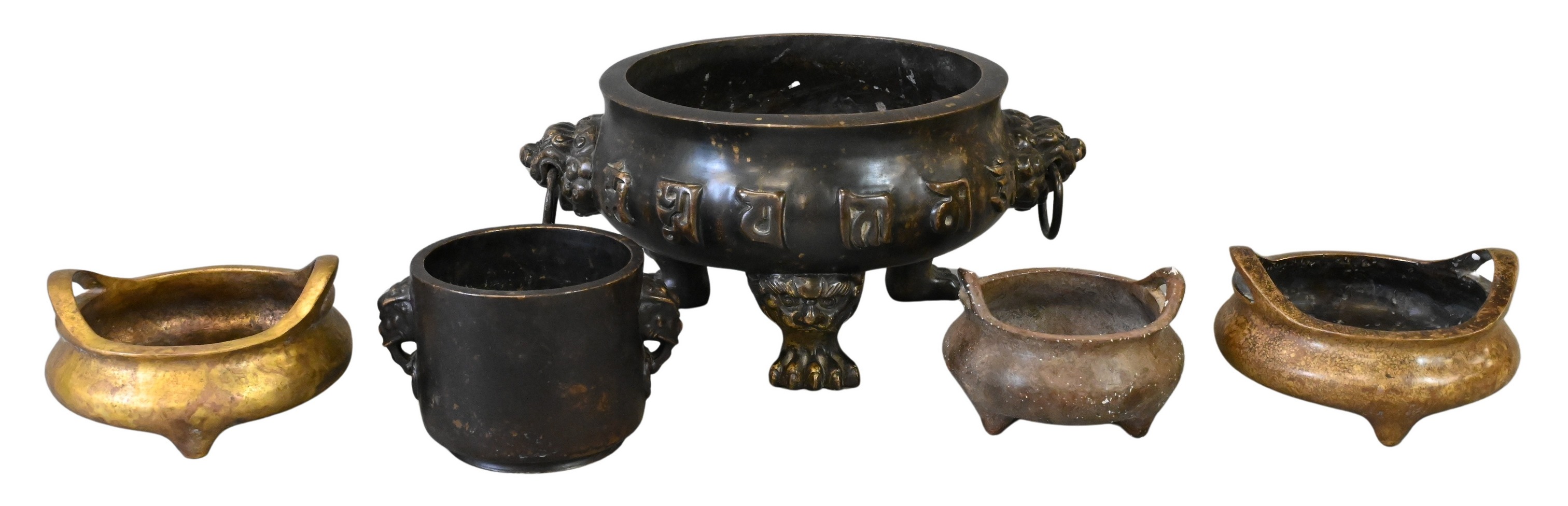 to include patinated bronze censer raised on three paw feet with lion mask handles, smaller vessel having elephant mask handles, pair of smaller gilt vessels along with additional smaller vessel
