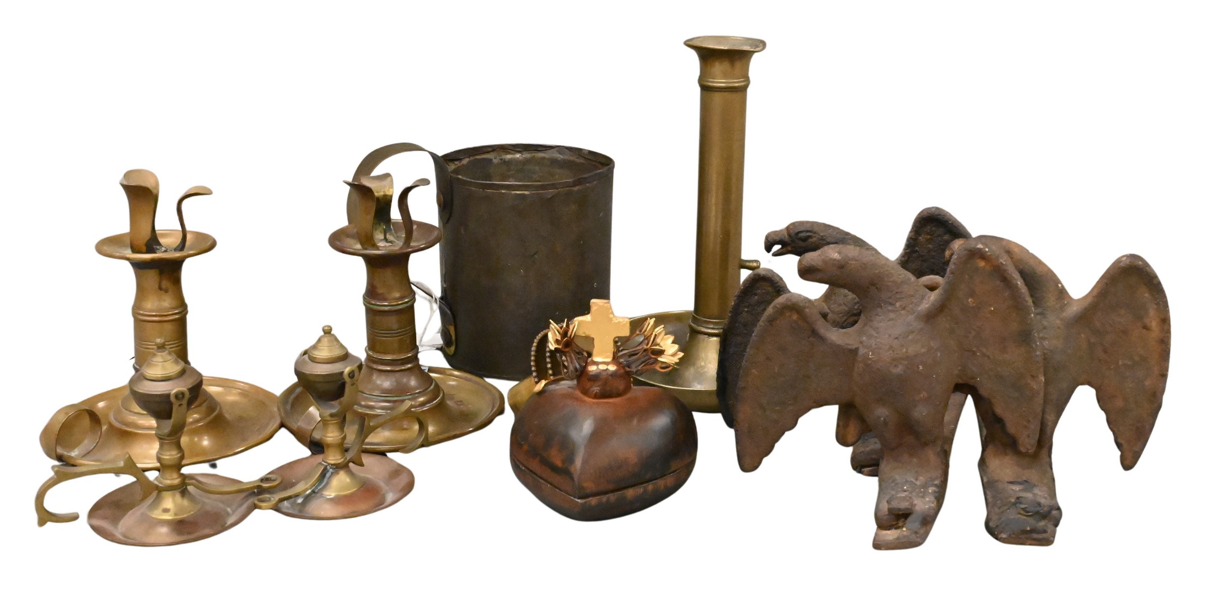 antique finely turned brass gimbal ship whale oil lamps set on a heavy round dish, three early 18th century cast iron eagle andirons, three candlesticks (height 8 inches) etc…