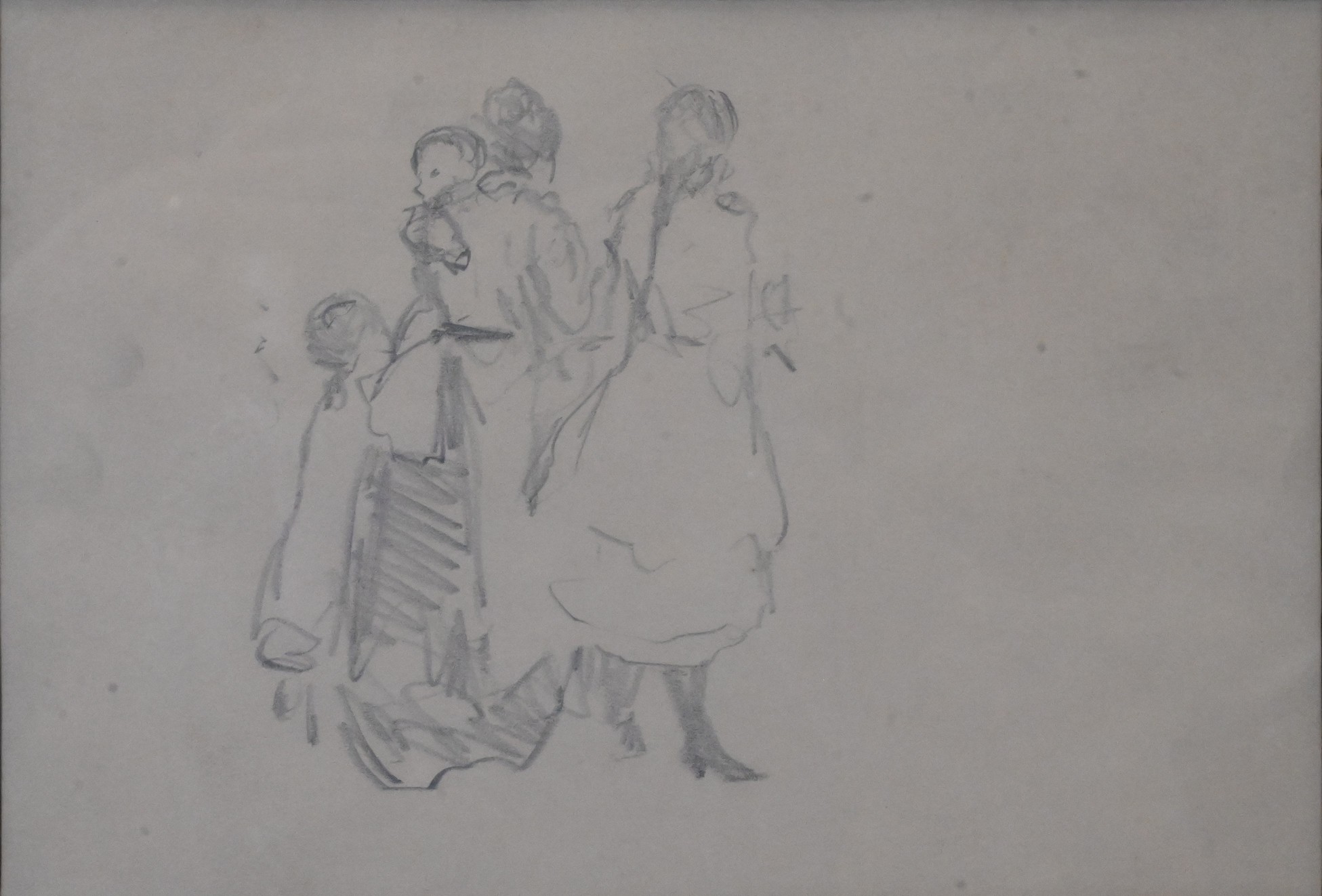 Light graphite sketch depicting a small group of figures, including a woman holding a child and two additional children at her side, rendered with quick, economical strokes characteristic of late 19th- to early 20th-century Impressionist draftsmanship; the loose handling and emphasis on gesture recall preparatory studies by Camille Pissarro and his circle