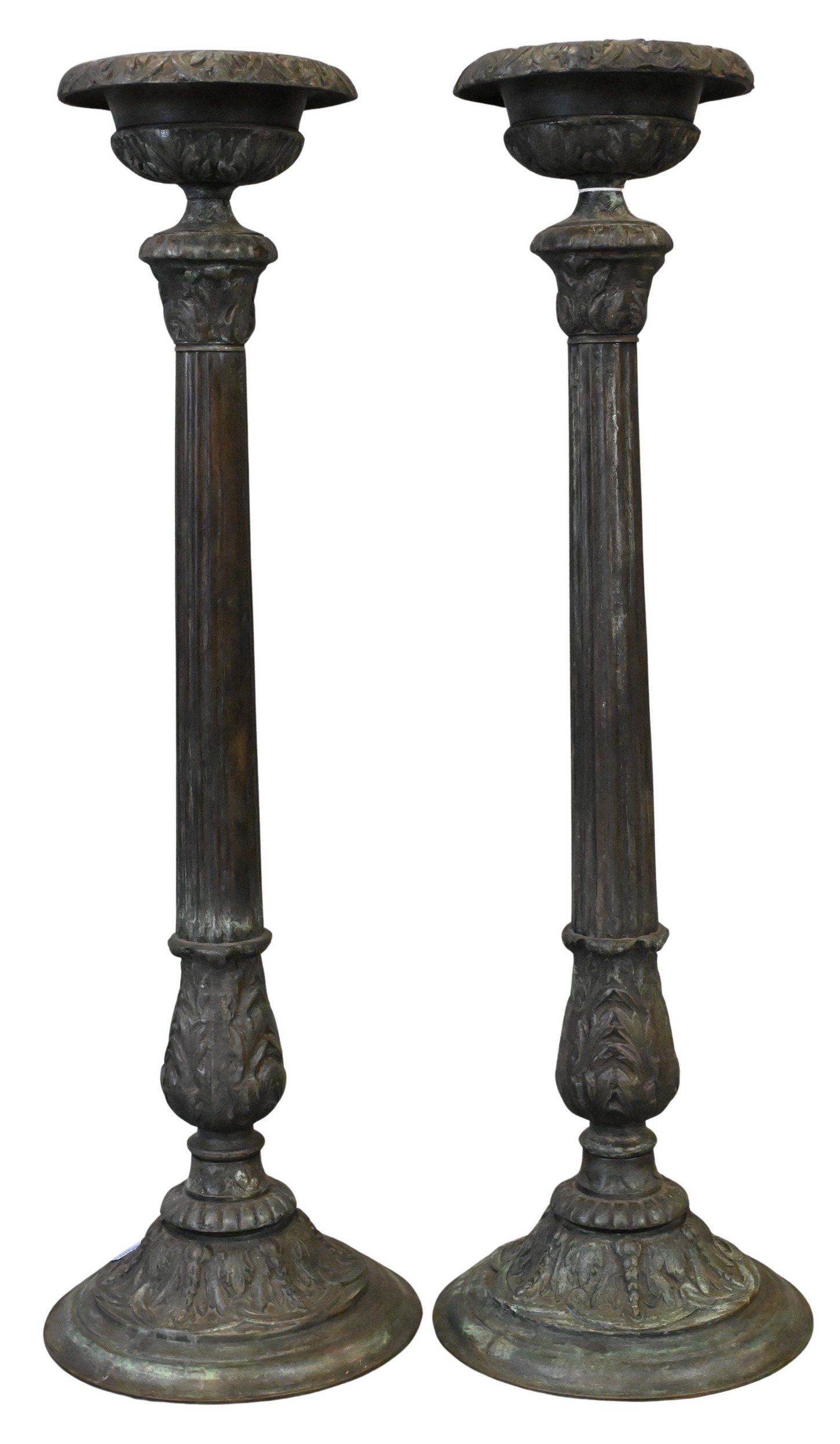 or pricketts of fluted pillar form with corinthian column pediment surmounted by urn form bowl, marked Maitland Smith