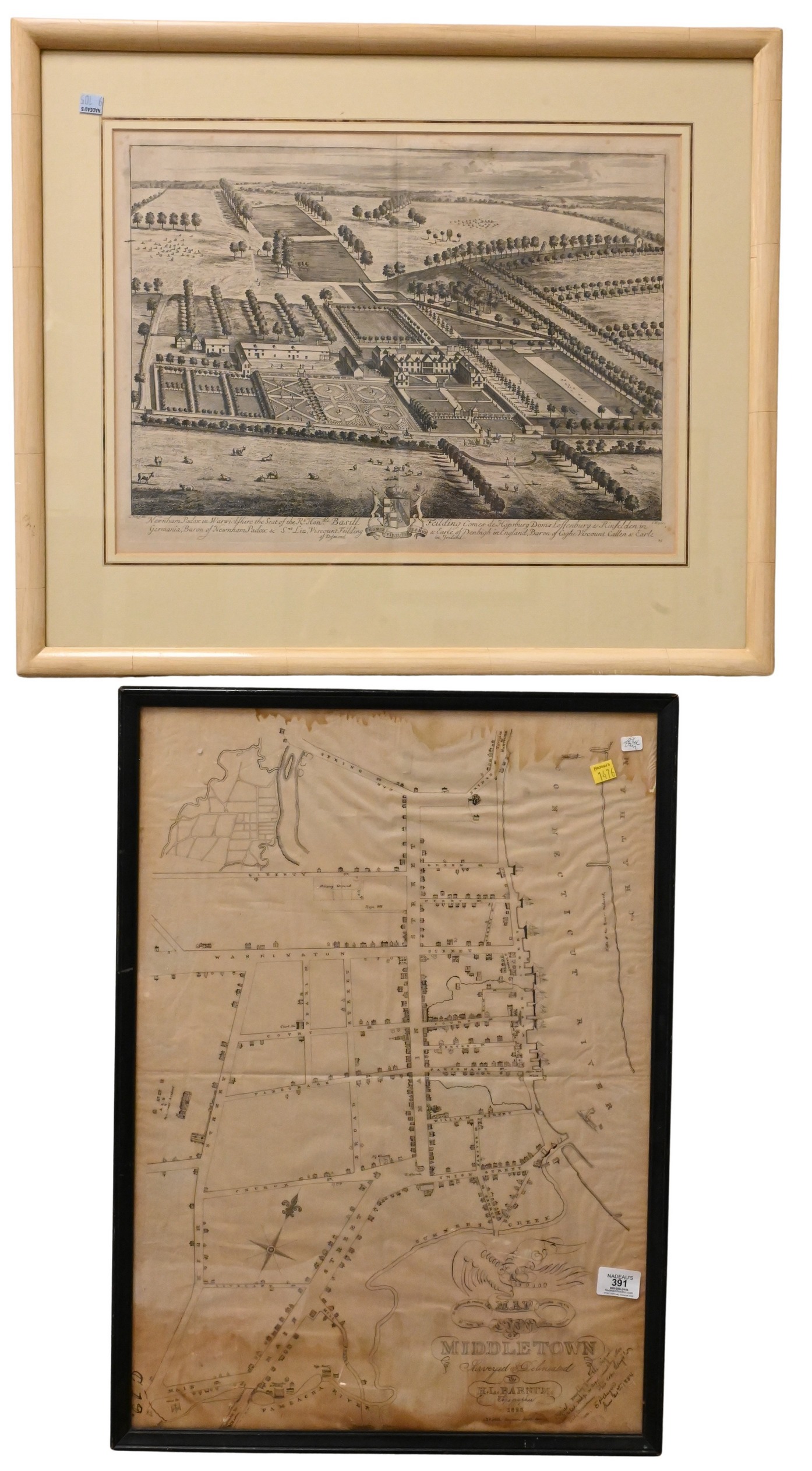 after Braun & Hogenberg reproduction engraving with hand coloring from Civitas Orbis Terrarum, (Warsaw, Poland) Varsovia, “L’Etat de Venise avec les Duches” hand colored map of Venice, “Plan de Venise” , “Newnham Paddox in Warwickshire” Kip, Johannes & Knyff, Leonard, originally published 1709, along with Hand Drawn Map of Middletown (1825)surveyed and delineated by H. L Barnum, Middletown CT