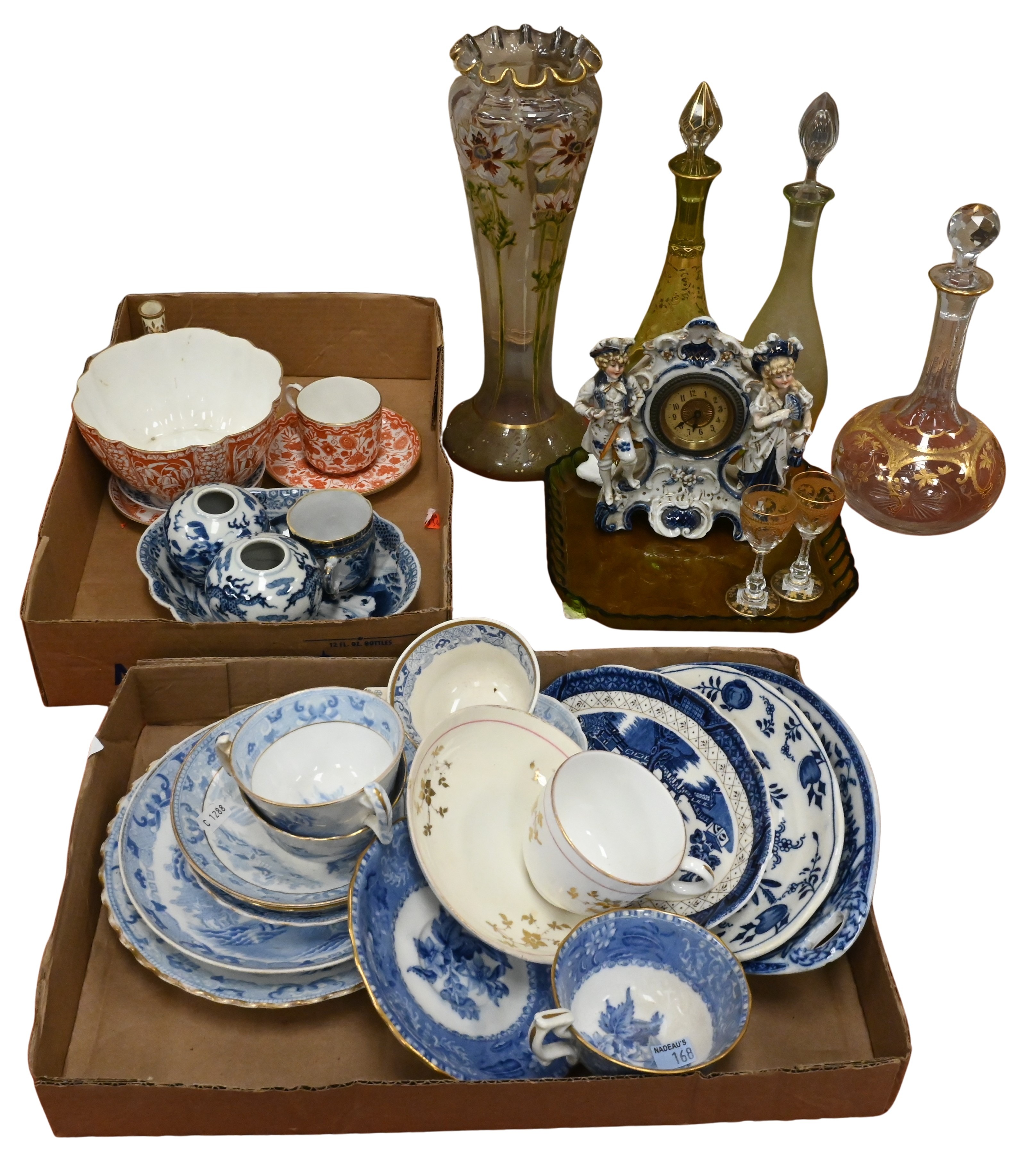 bohemian gilt glass decanters and stems, floral vase, Royal Doulton small plates, continental figural clock, teacups, underplates