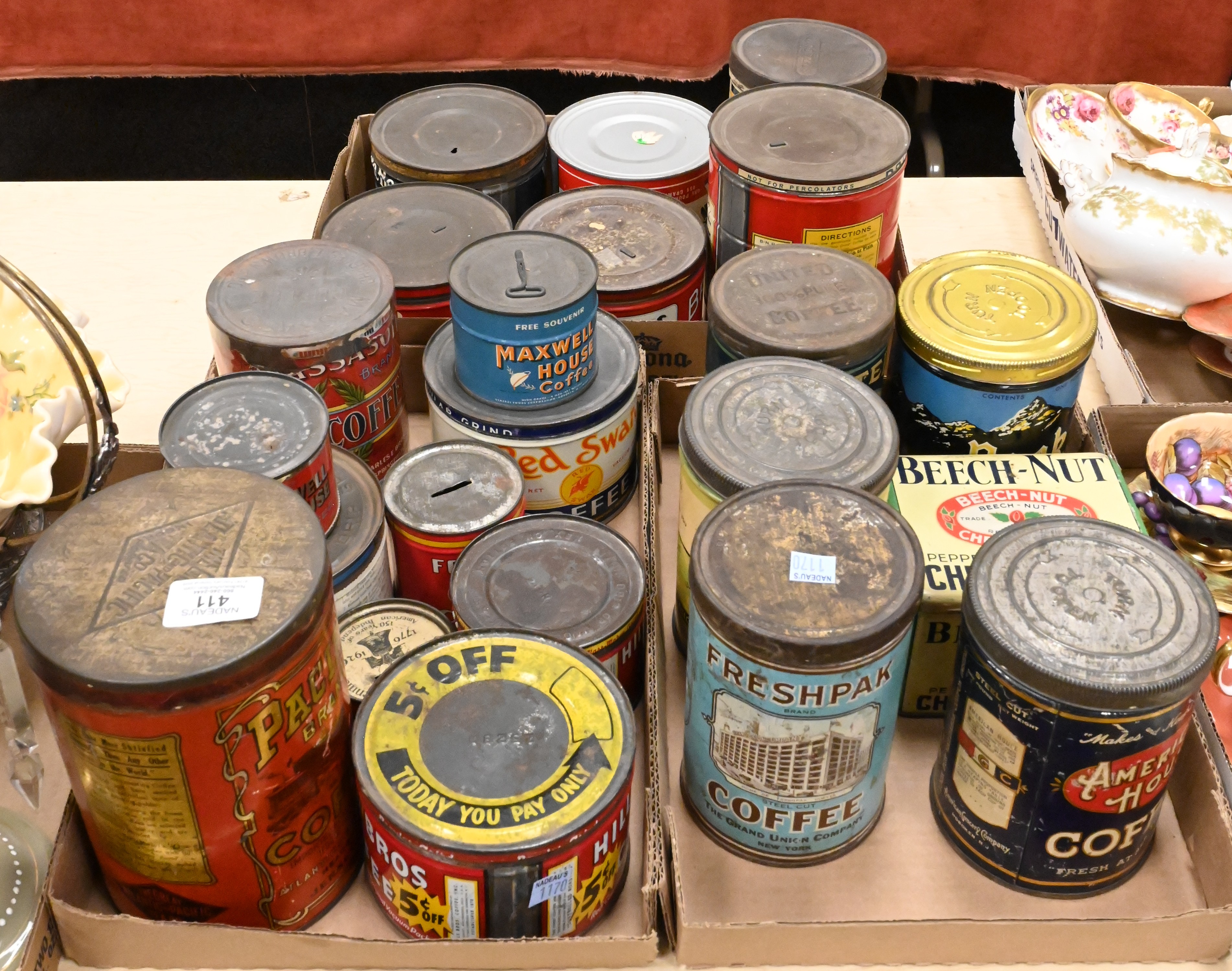Including a collection of lithographed tin coffee cans by various American and European makers, Pacific Brand, Massasoit, Beech Nut Chewing Gum, Freshpak Maxwell House, Mothers Joy, Massasoit, Montco, Red Swan, Beech Nut, Sanka, Dwinell Wright Co. White House Coffee, Royal Scarlet, Yacht Club, Hills Bros., Boscul, Breakfast Cheer, Folgers, Peak; featuring bold typography, figural and emblematic graphics, and period branding