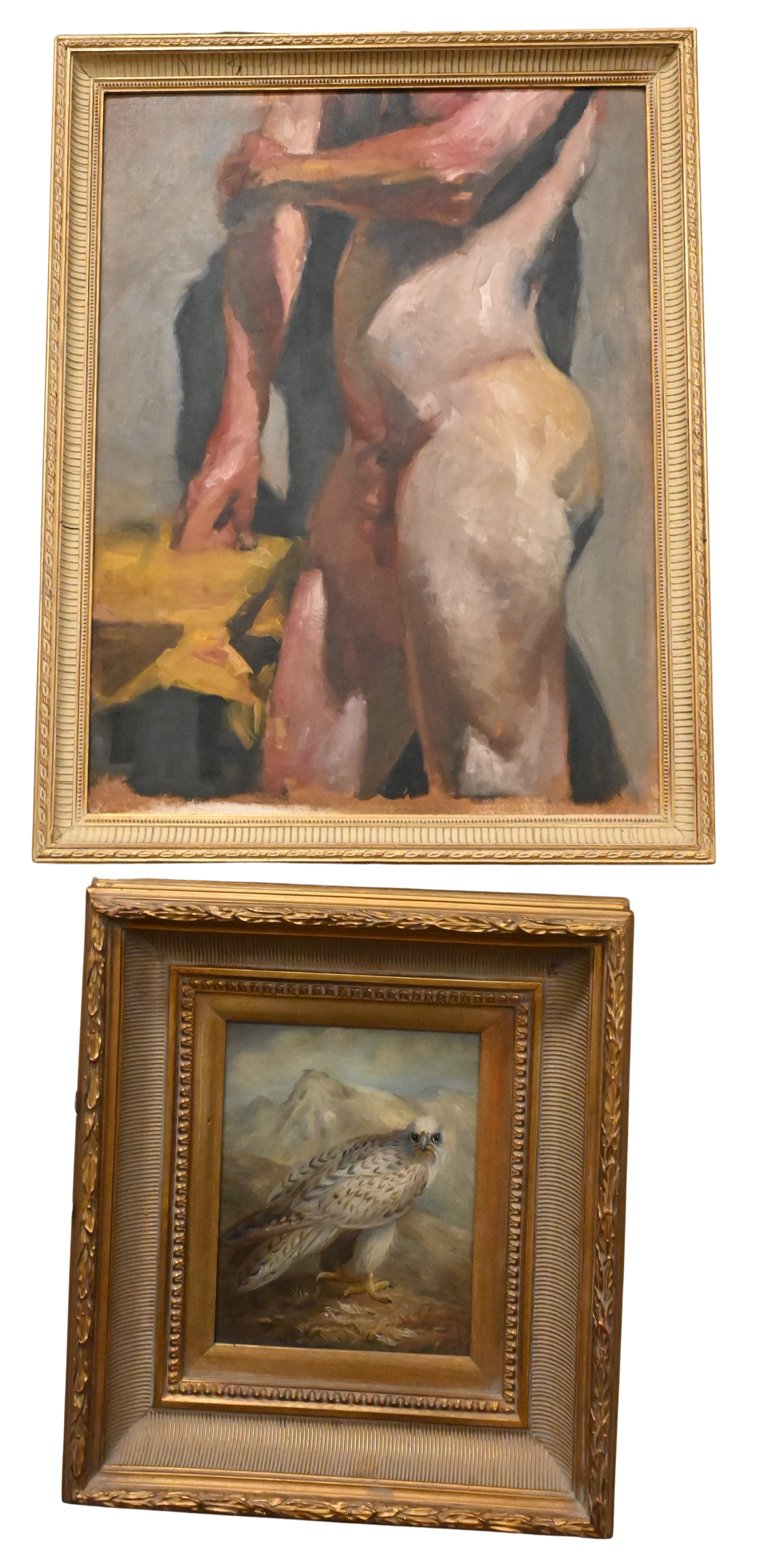 oil painting of a bird, abstract composition, two Don Keene figure studies, watercolor on paper “Mississippi Cotton”, etc…