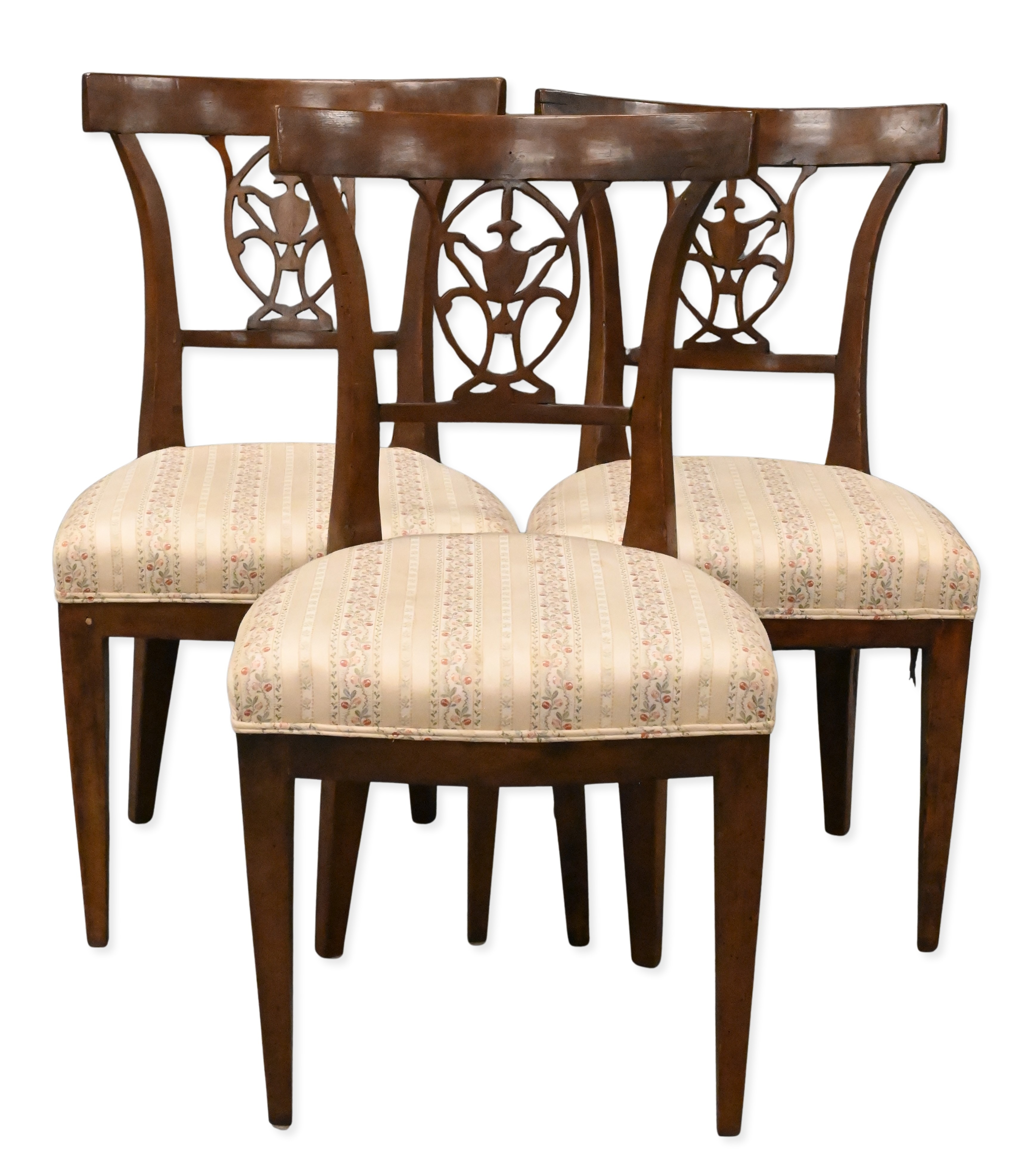 each having a flaring back incorporating a pierced oval medallion a central urn, the upholstered seat on square tapering legs