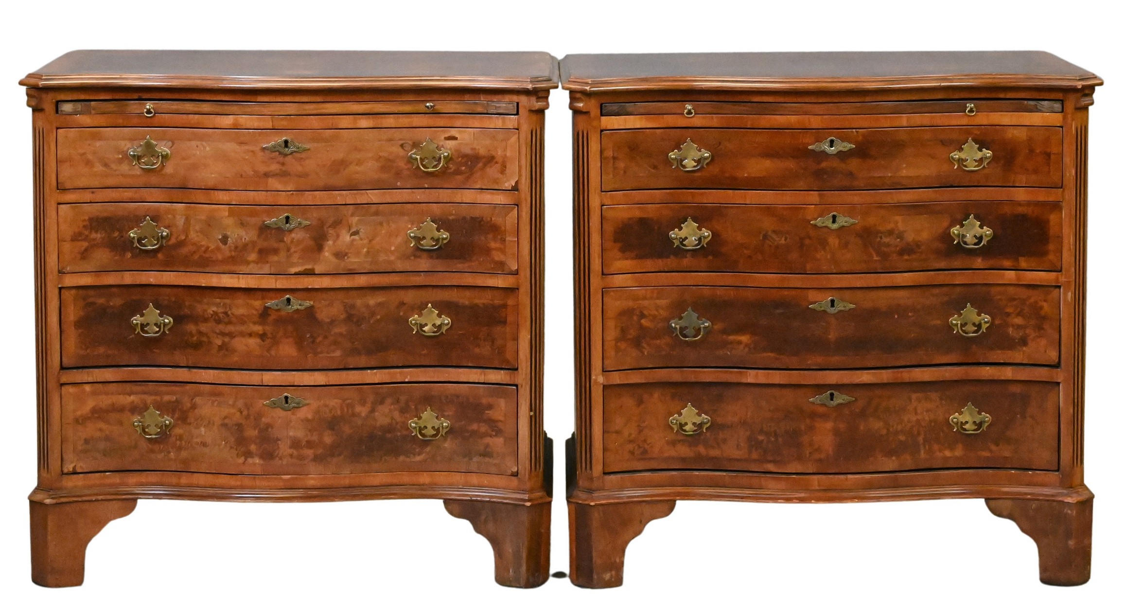 each top a serpentine-shaped front and molded edge above a drawer slide and four graduated long drawers flanked by fluted corner columns, on bracket
