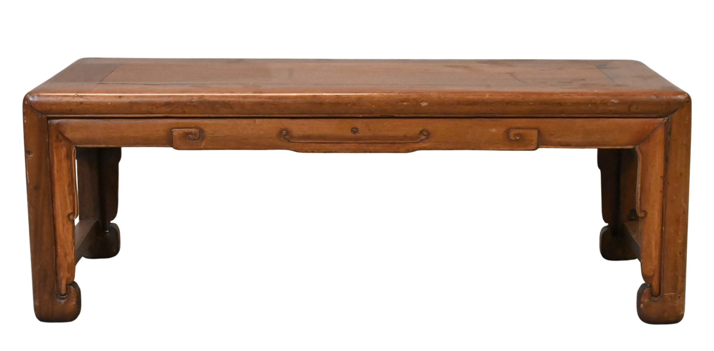 serpentine-shaped top, above a plain apron and turned, tapering legs terminating in pad feet, opening to a polished interior