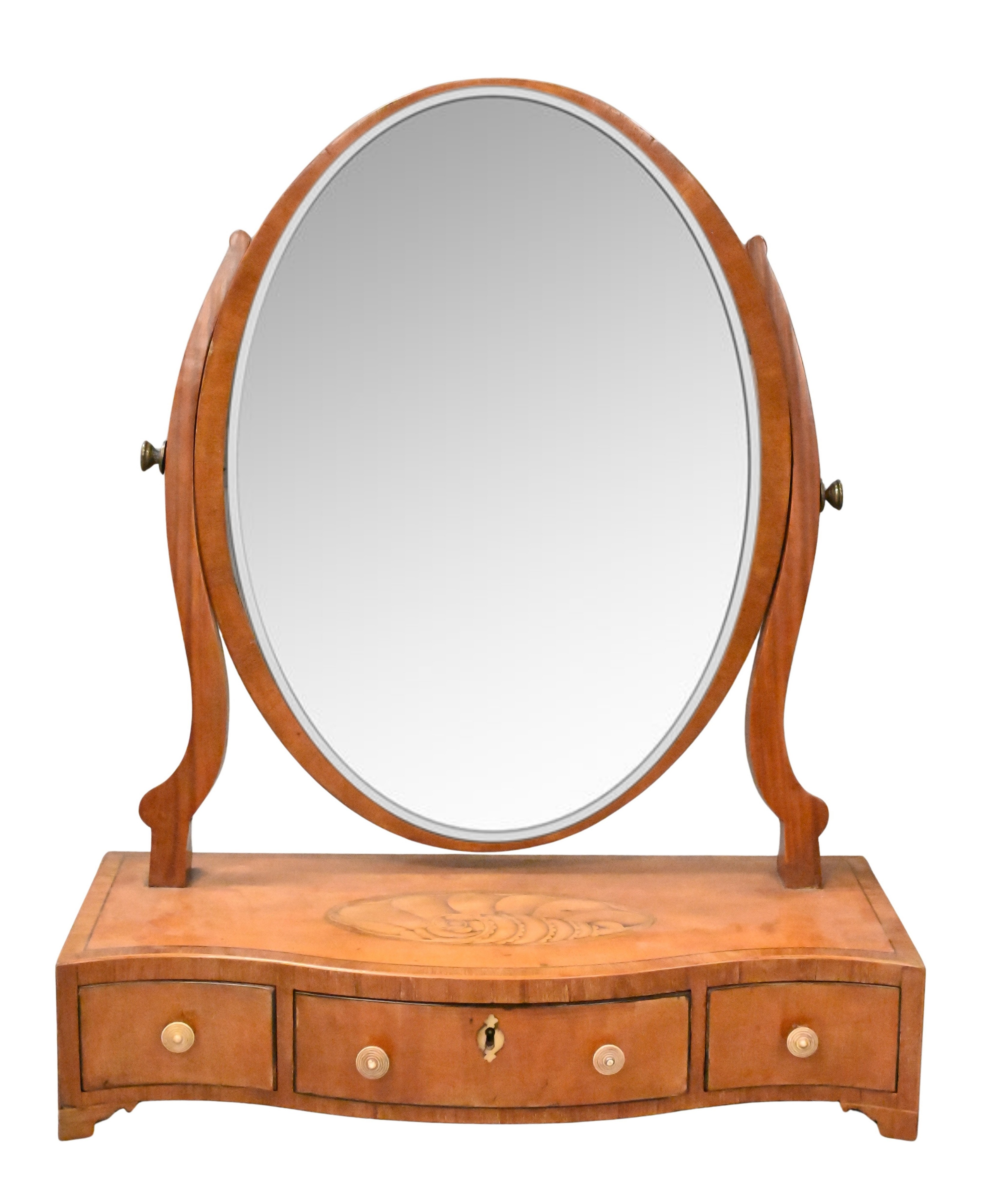 oval mirror plate supported on shaped uprights above a serpentine-front base fitted three small drawers, the top centered an inlaid shell motif