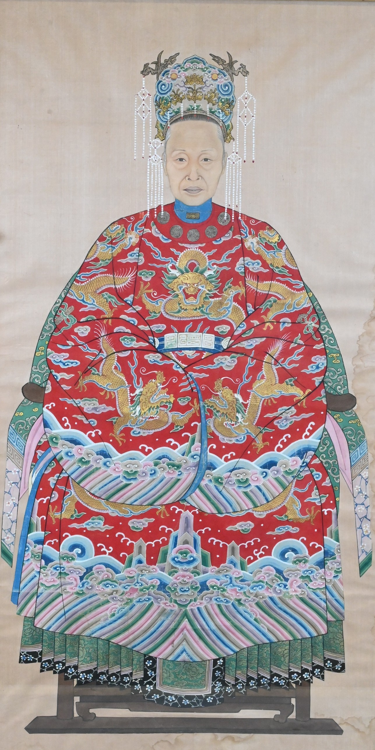 portrait depicting a seated noblewoman in full formal court attire, wearing a brilliant red robe embroidered with four-clawed dragons among clouds and waves, accented with phoenixes and auspicious motifs, elaborate headdress having floral ornament, tassels, and pearl strands