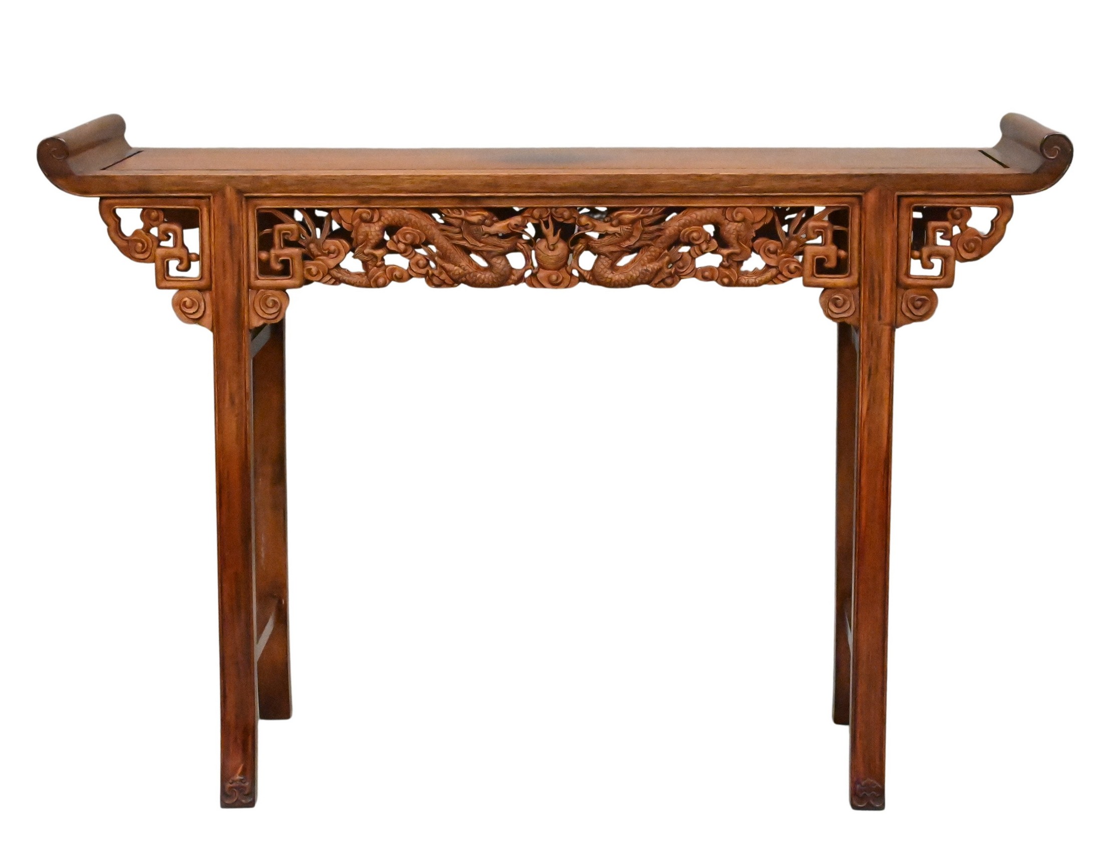 rectangular top, molded ends above a carved frieze depicting confronting dragons amid scrolling foliage, openwork spandrels and straight legs joined by stretchers, warm medium-brown finish, top sun fading and a darker circular area likely from prolonged object placement