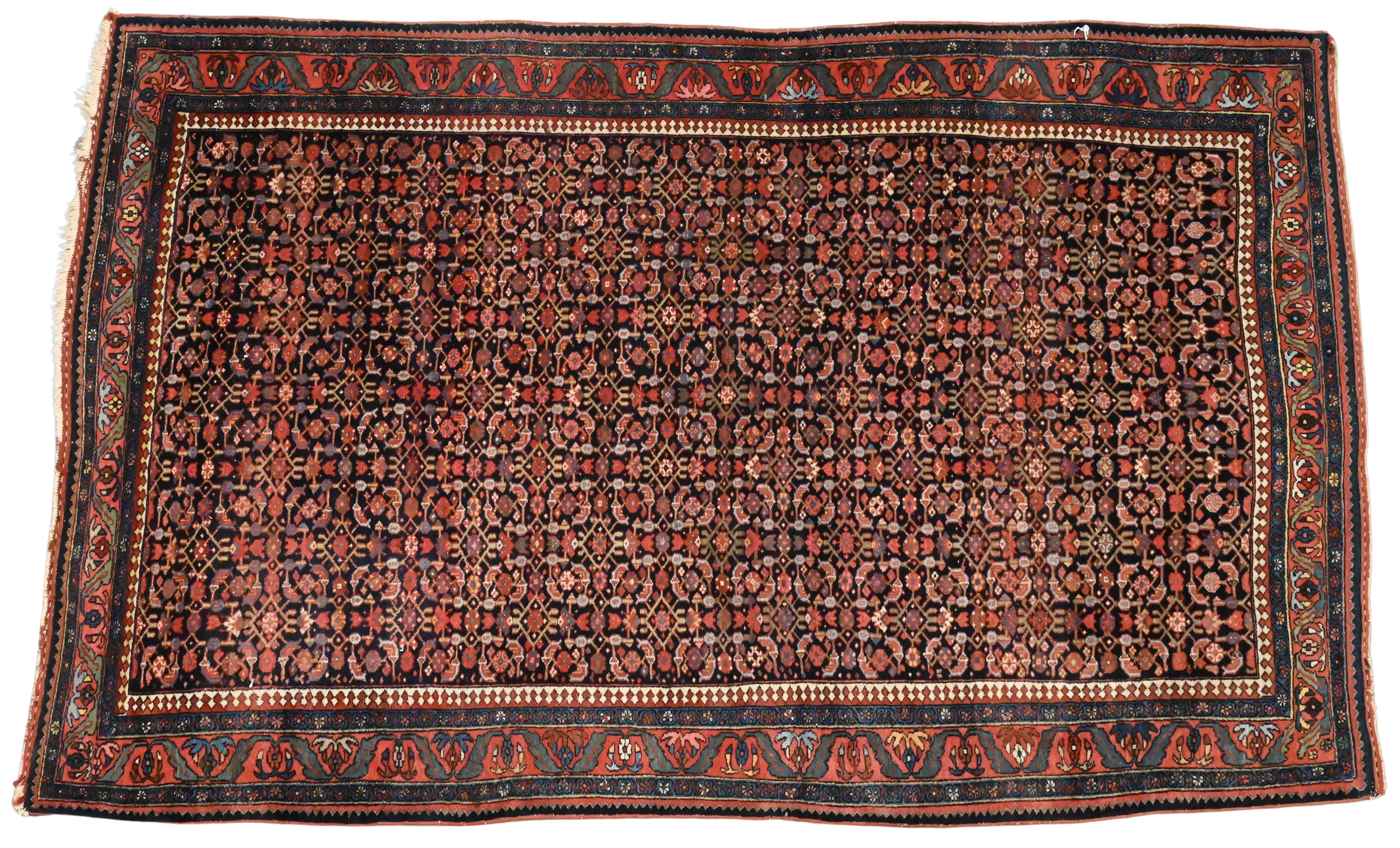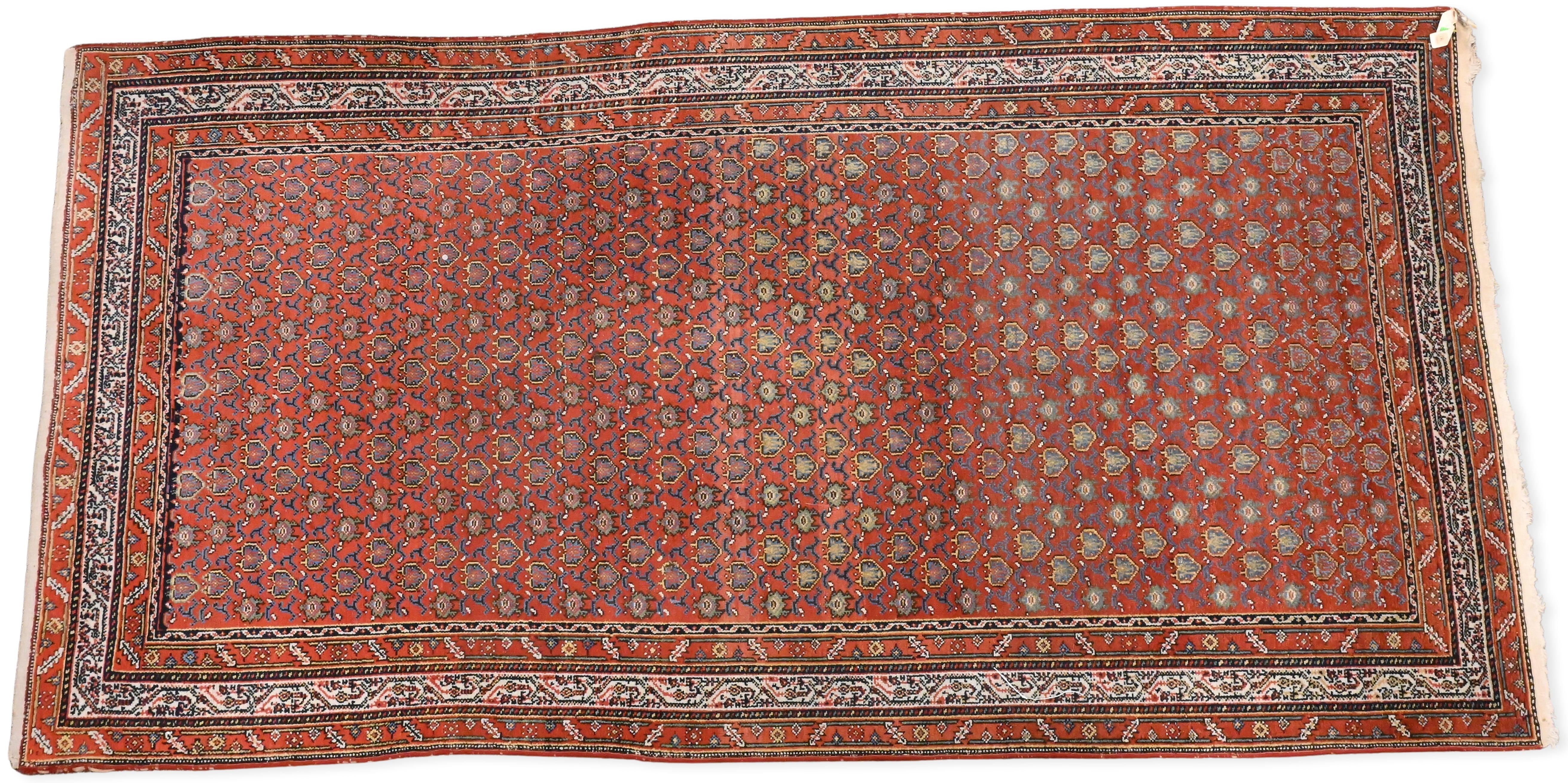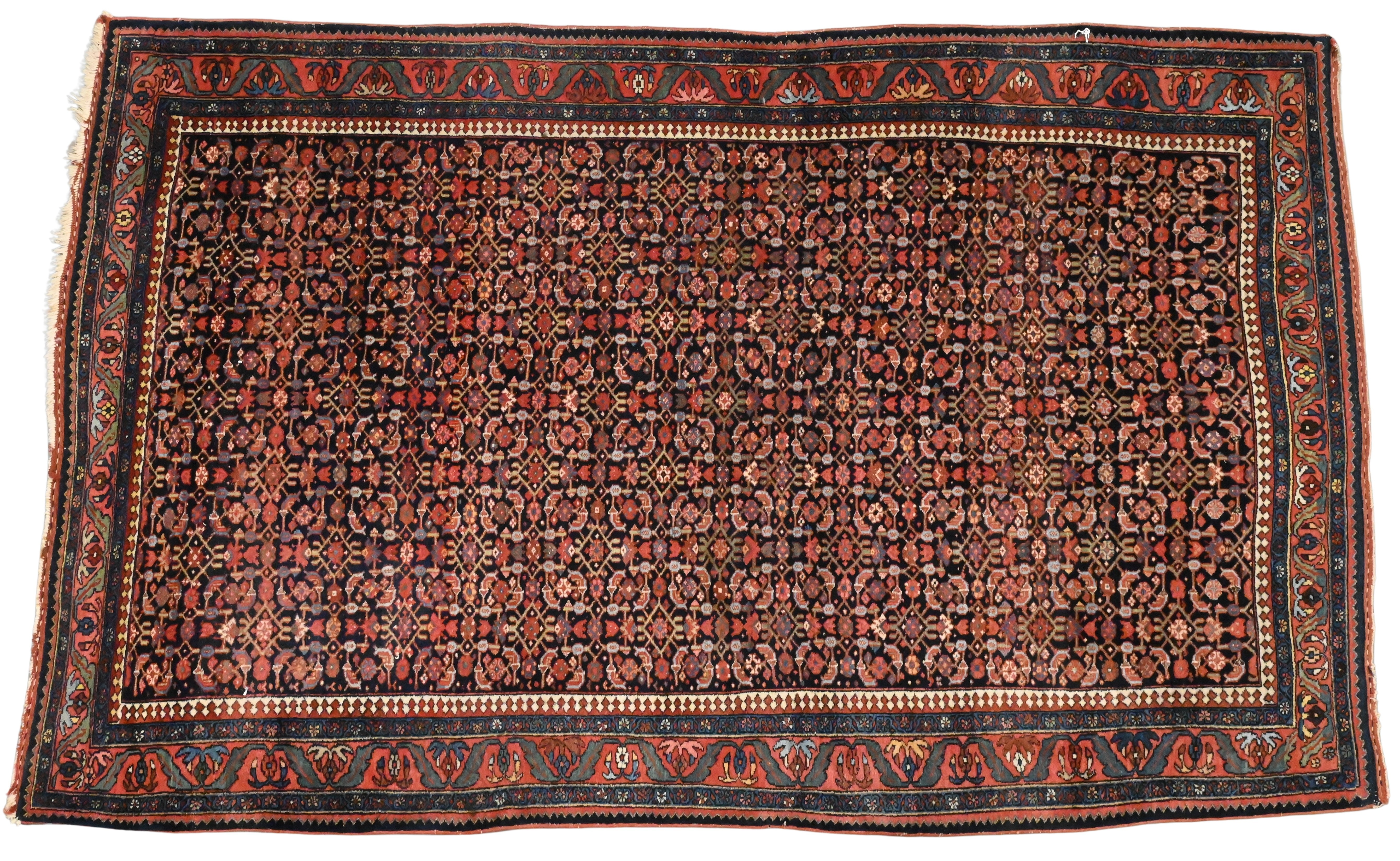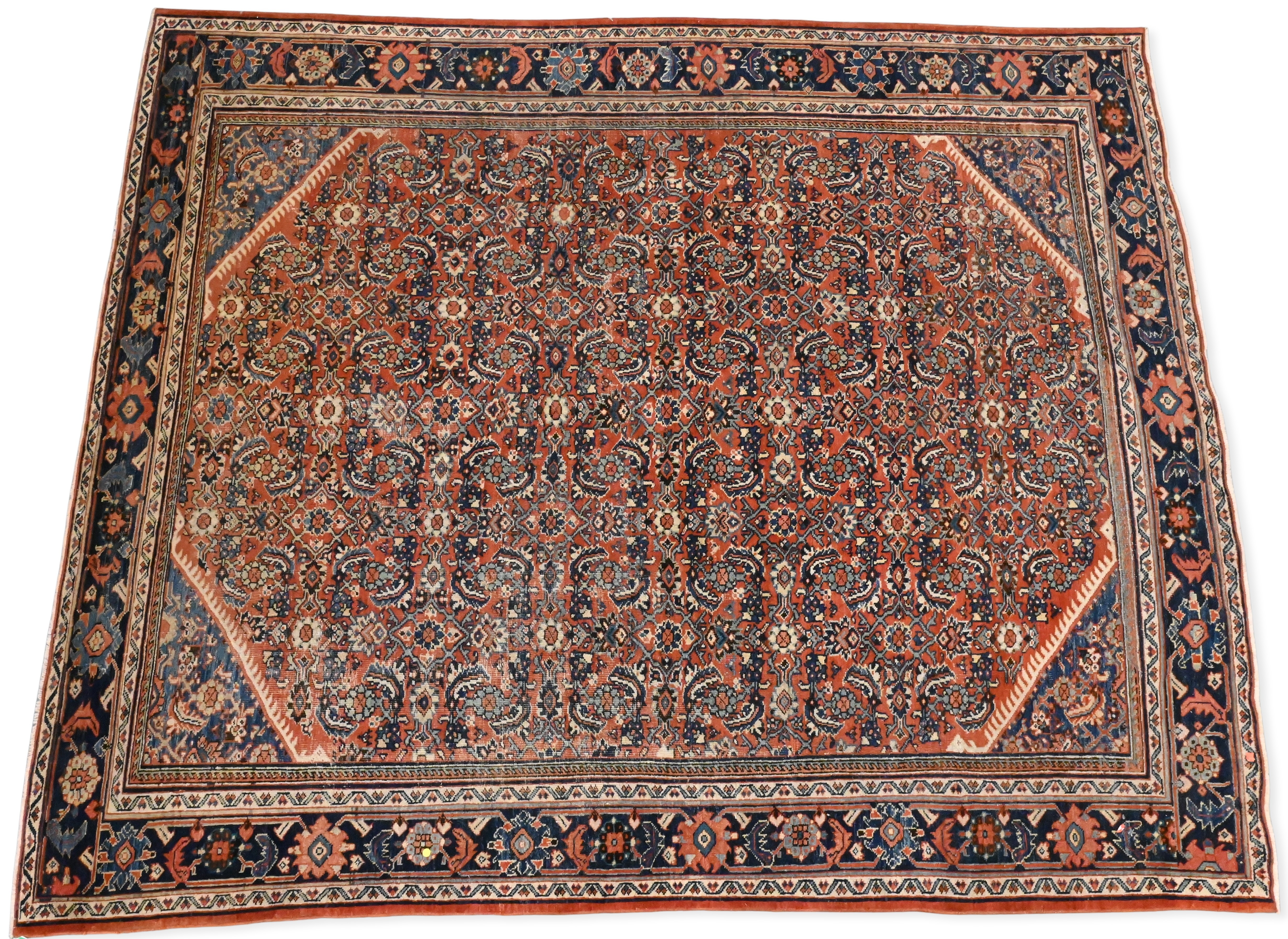 medium blue ground an allover “herati” pattern in a major pale red colored border of rosettes and geometric trellis, early 20th century