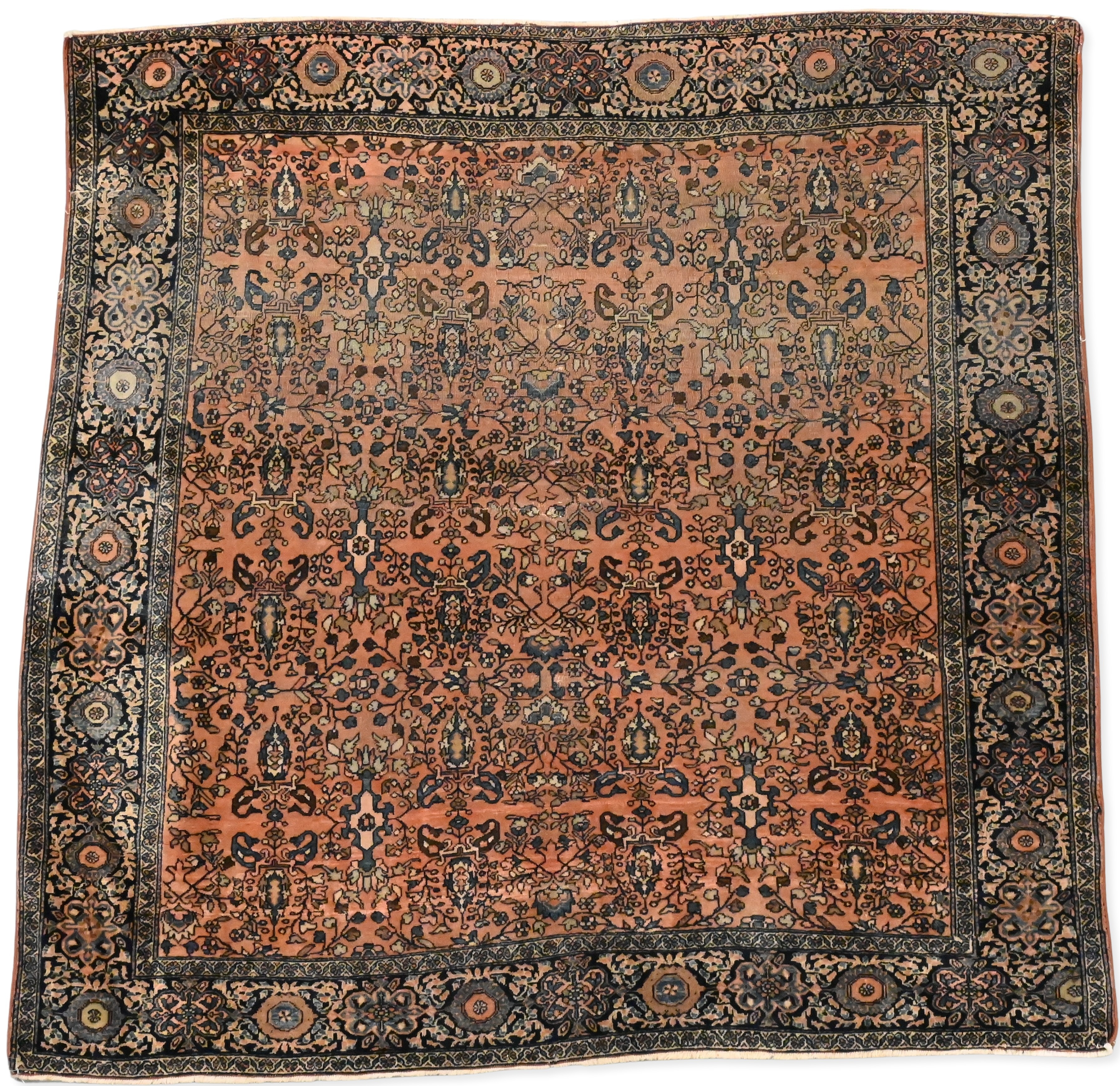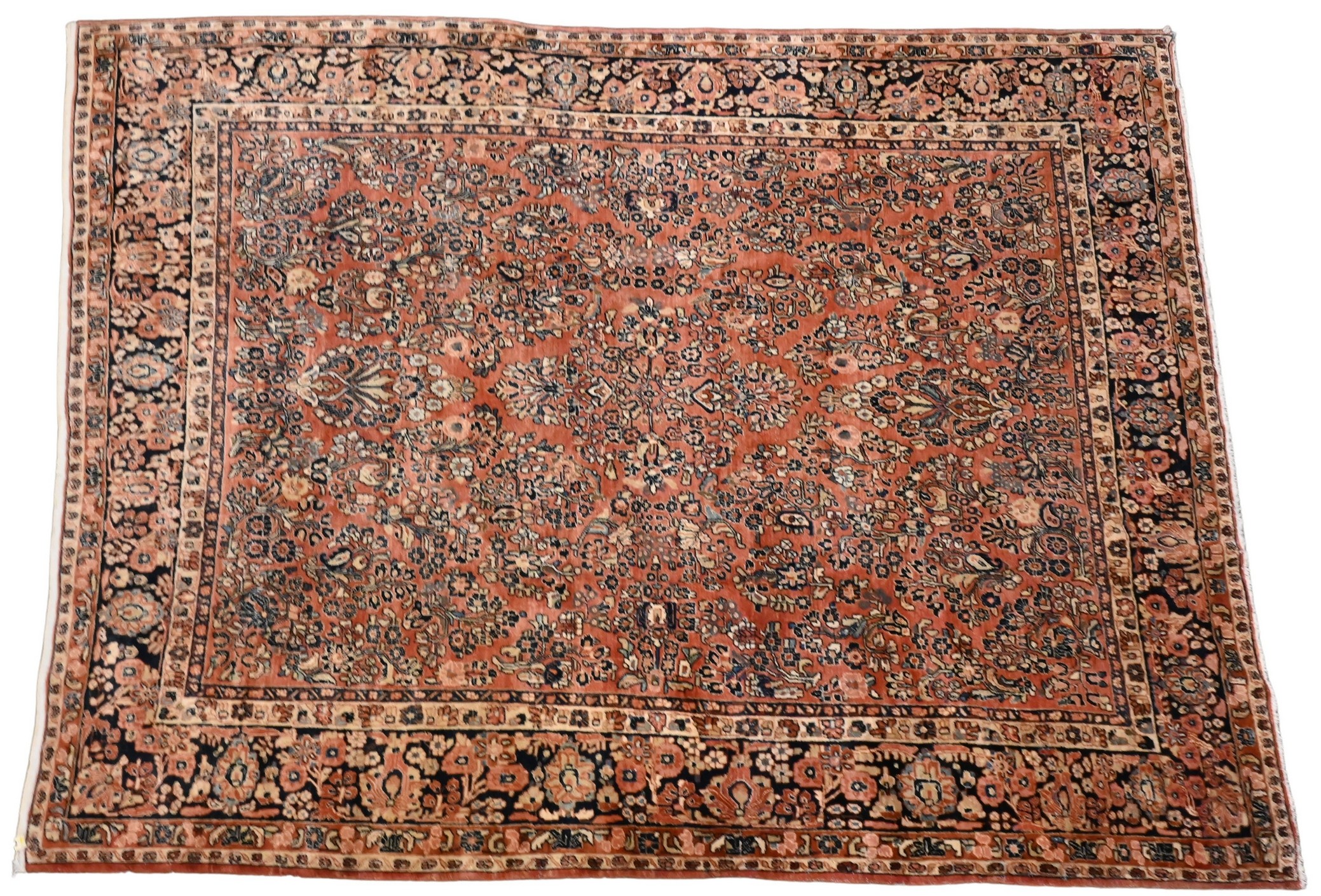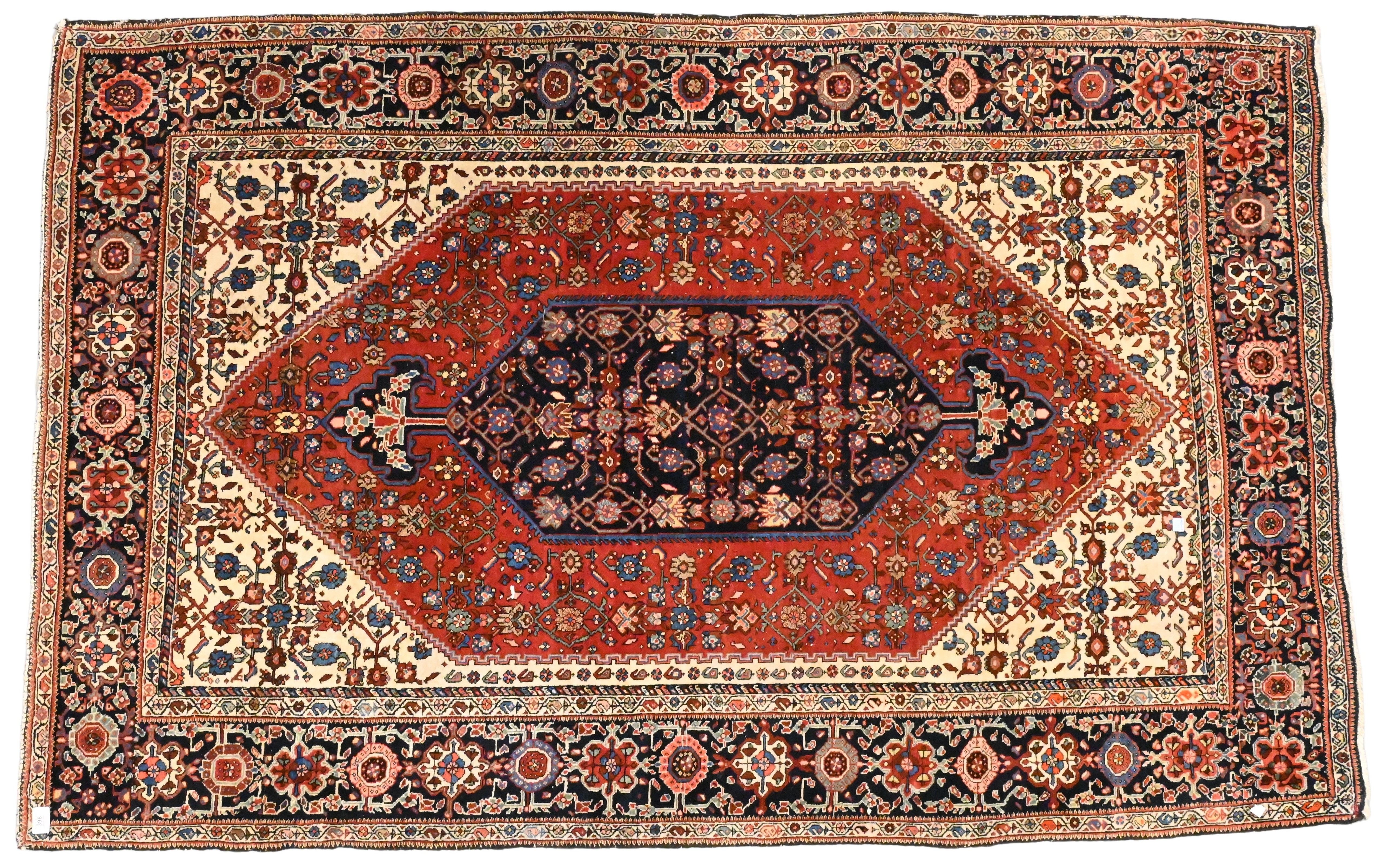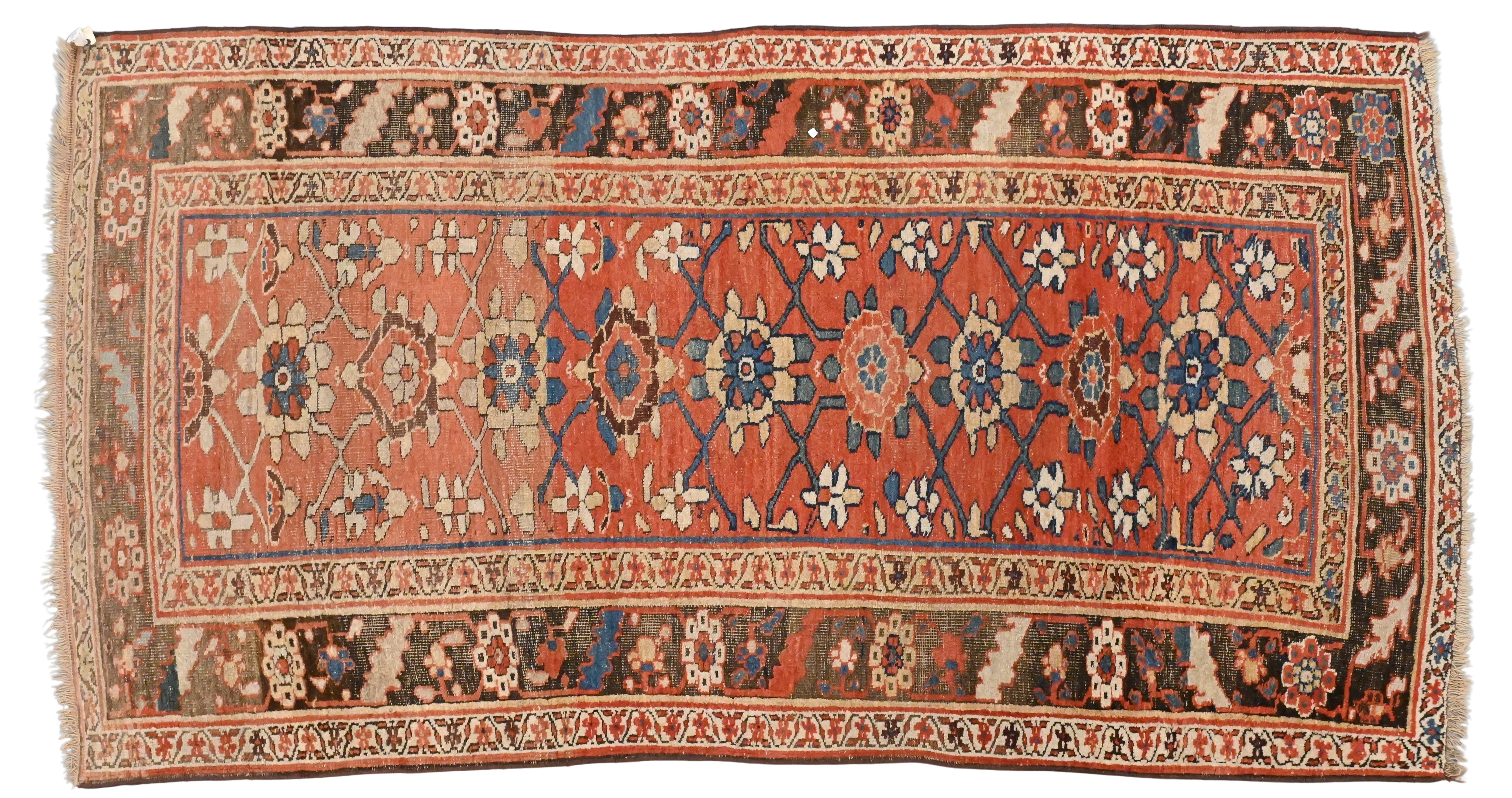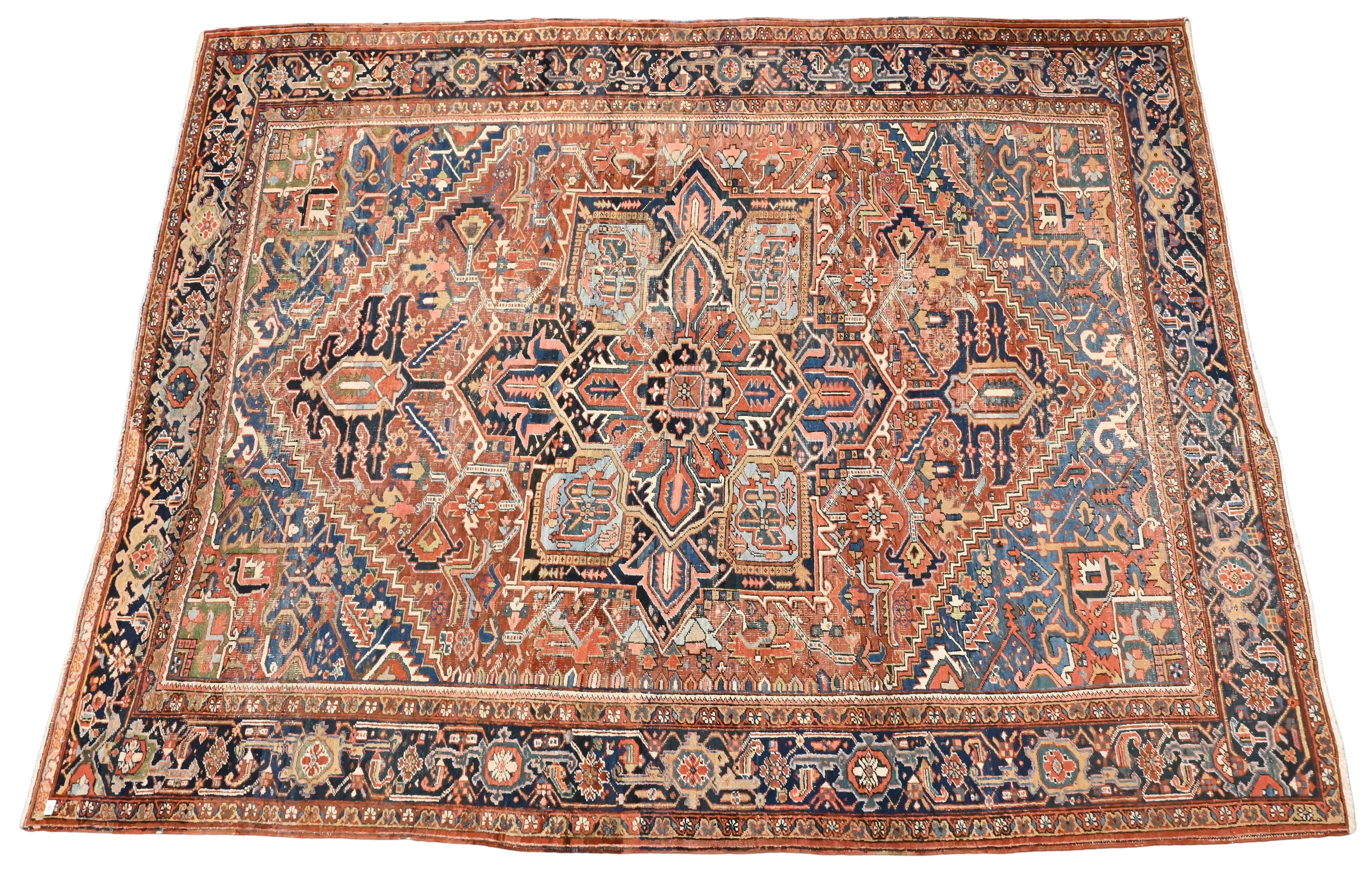 medium blue ground an allover “herati” pattern in a major pale red colored border of rosettes and geometric trellis, early 20th century