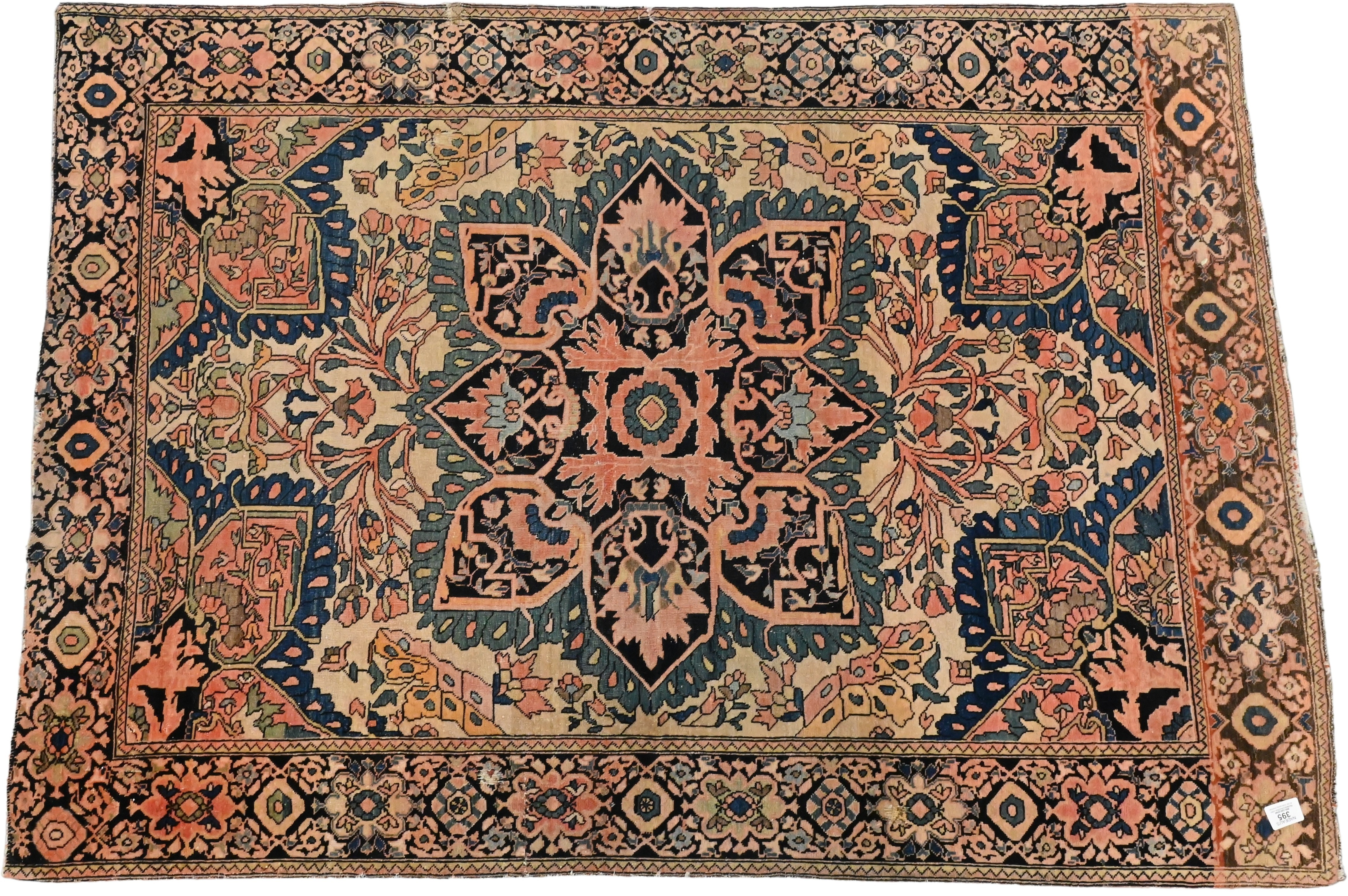 tan ground an all over repeating rosette and leaf lattice pattern set in tiles in an outer border of geometric trellis, Southeast Persia, late 19th to early 20th Century