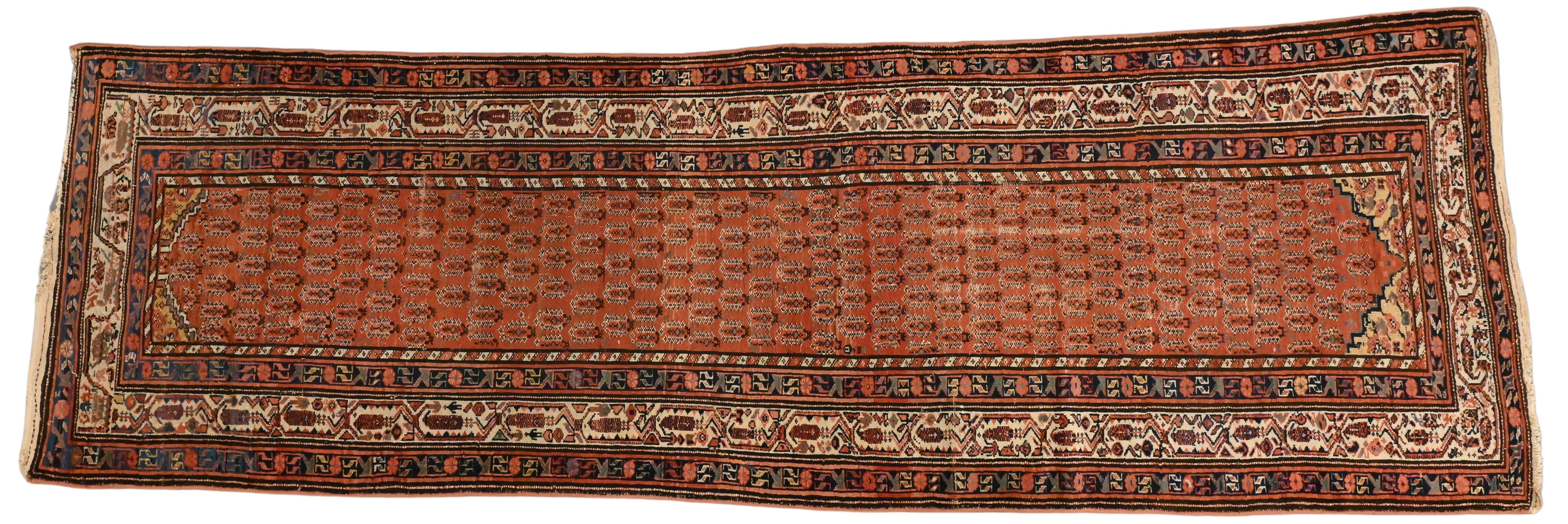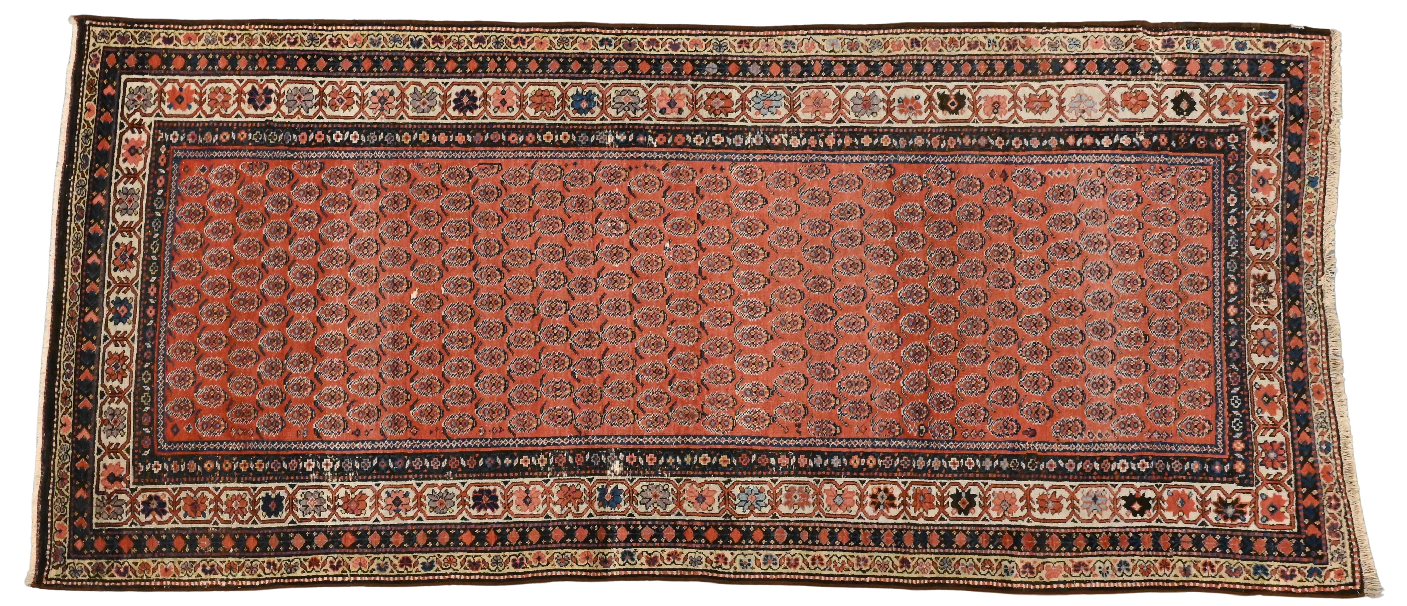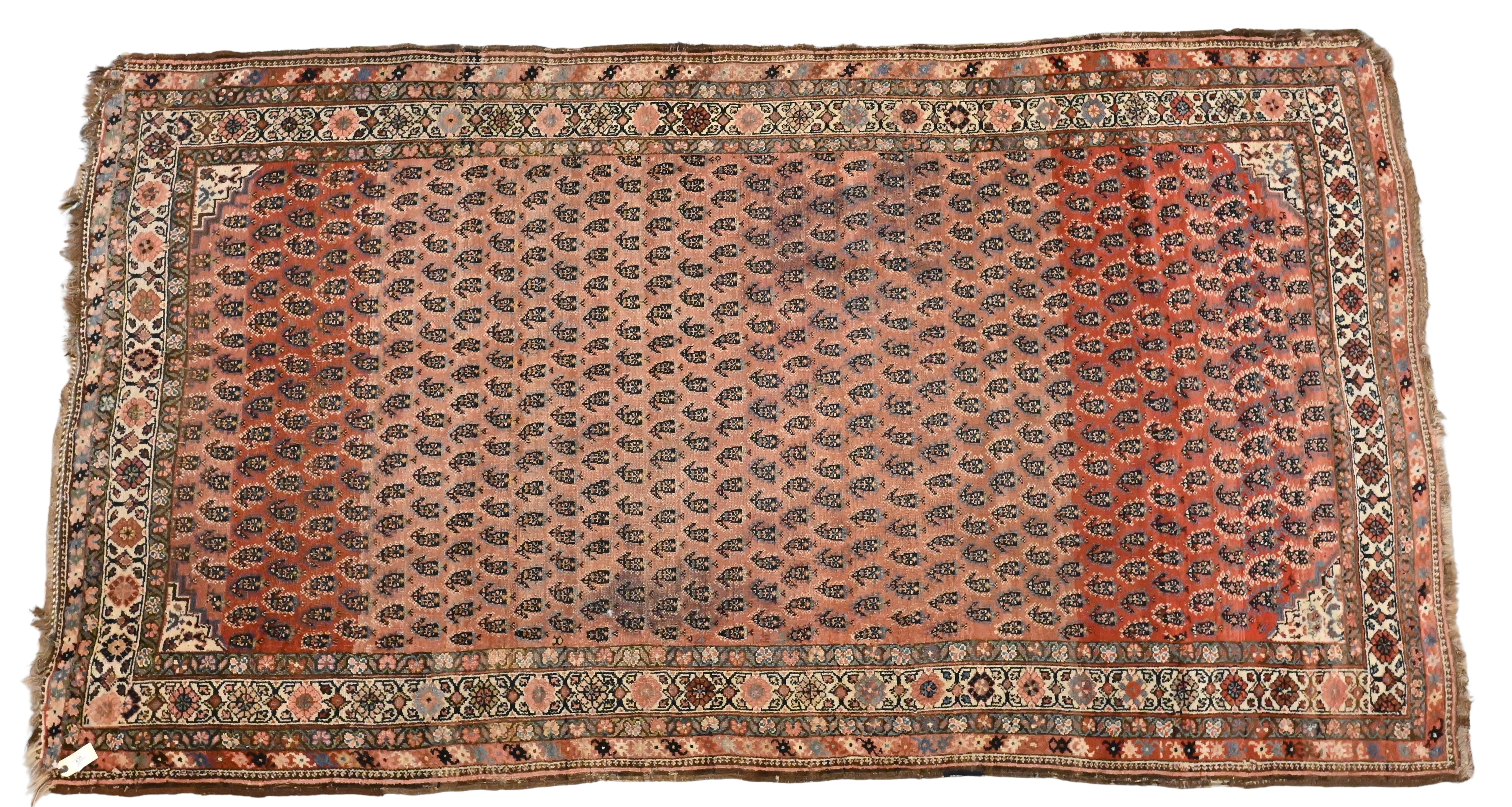 pale red colored ground decorated an allover repeating “boteh” in row design in multiple borders, early 20th century