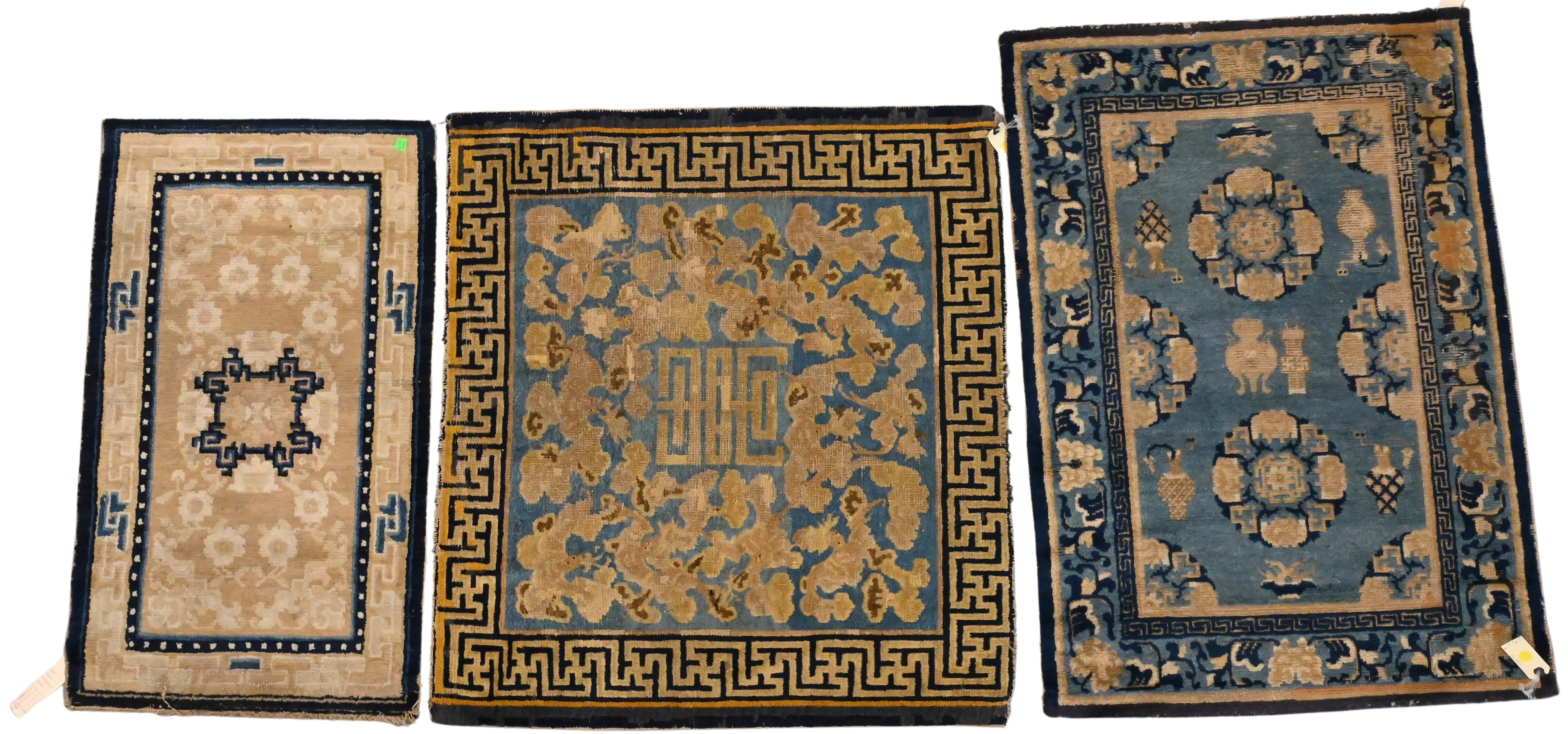 Conditions: Ningxia mat in overall poor condition fragmentary, wear and sun fading, cut and unraveled, Chineses rugs in fair to good condition one having trimmed fringes, one having minor wear