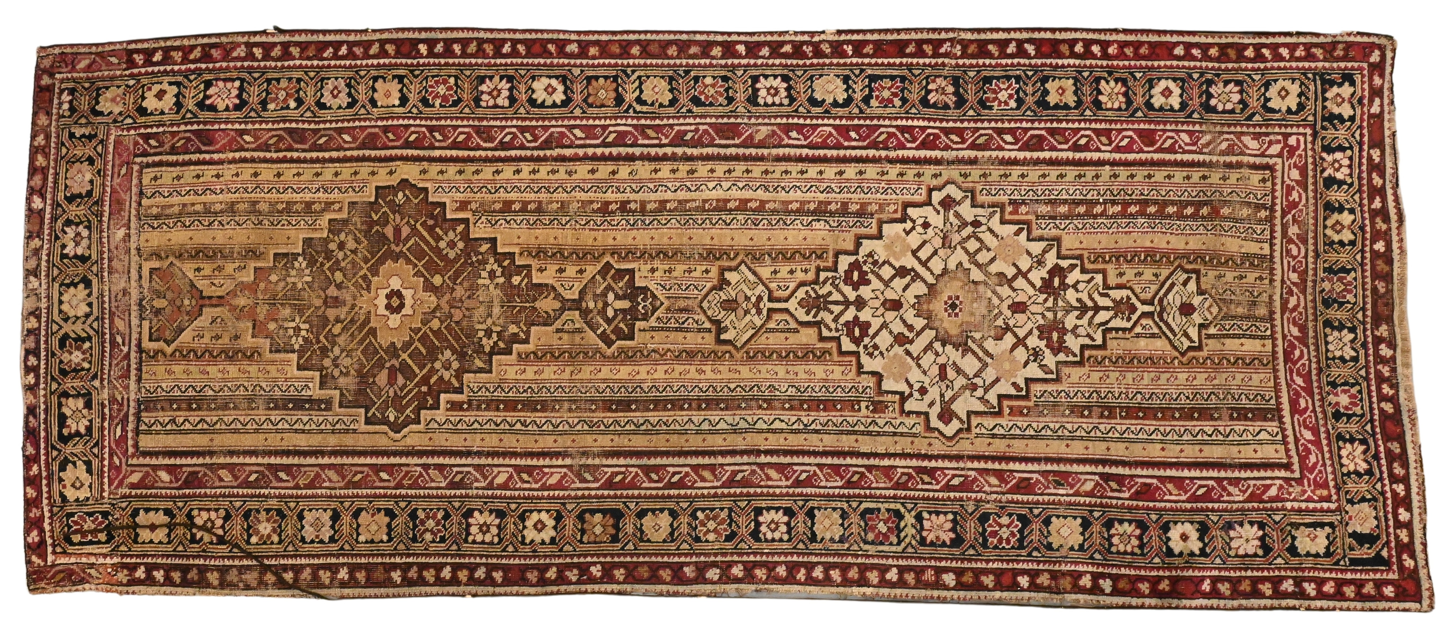 pale gold ground, central stepped diamond form lattice design surrounded by an outer border of stylized “botehs” and leaves, South Caucasus, late 19th Century