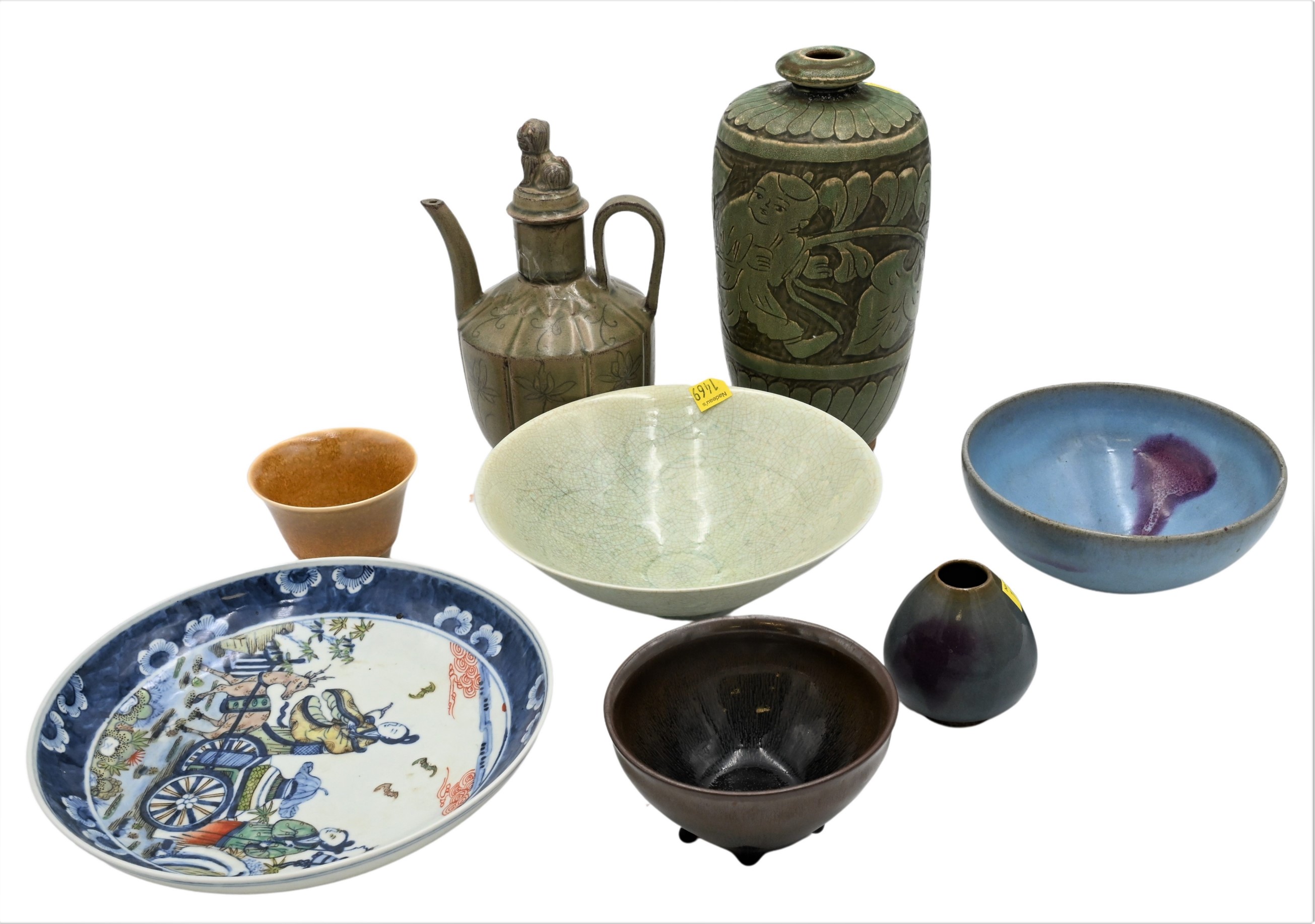 Nine Piece Group of Chinese Porcelain and Pottery, to include red glaze vase, blue glaze buddhas, celedon glazed bowl with incised decoration, two brown glazed cups, a blue glazed bowl, a rose famille plate, along with celadon vase etc.., tallest height 9 1/2 inches.