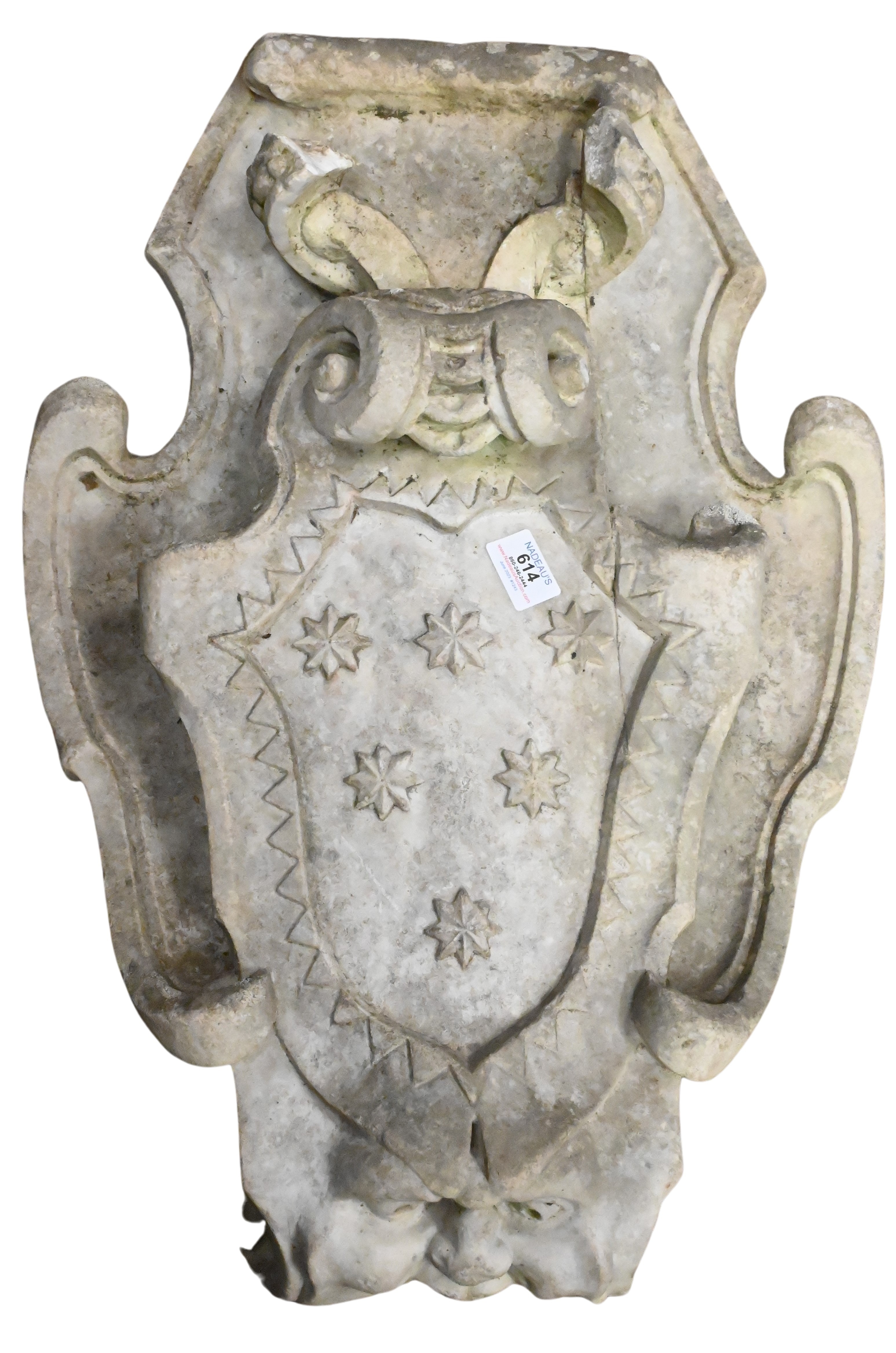 Marble Coat of Arms with Face at Bottom, 19th century or earlier, top section with repair, piece is off but available, height 27 inches, width 18 inches
