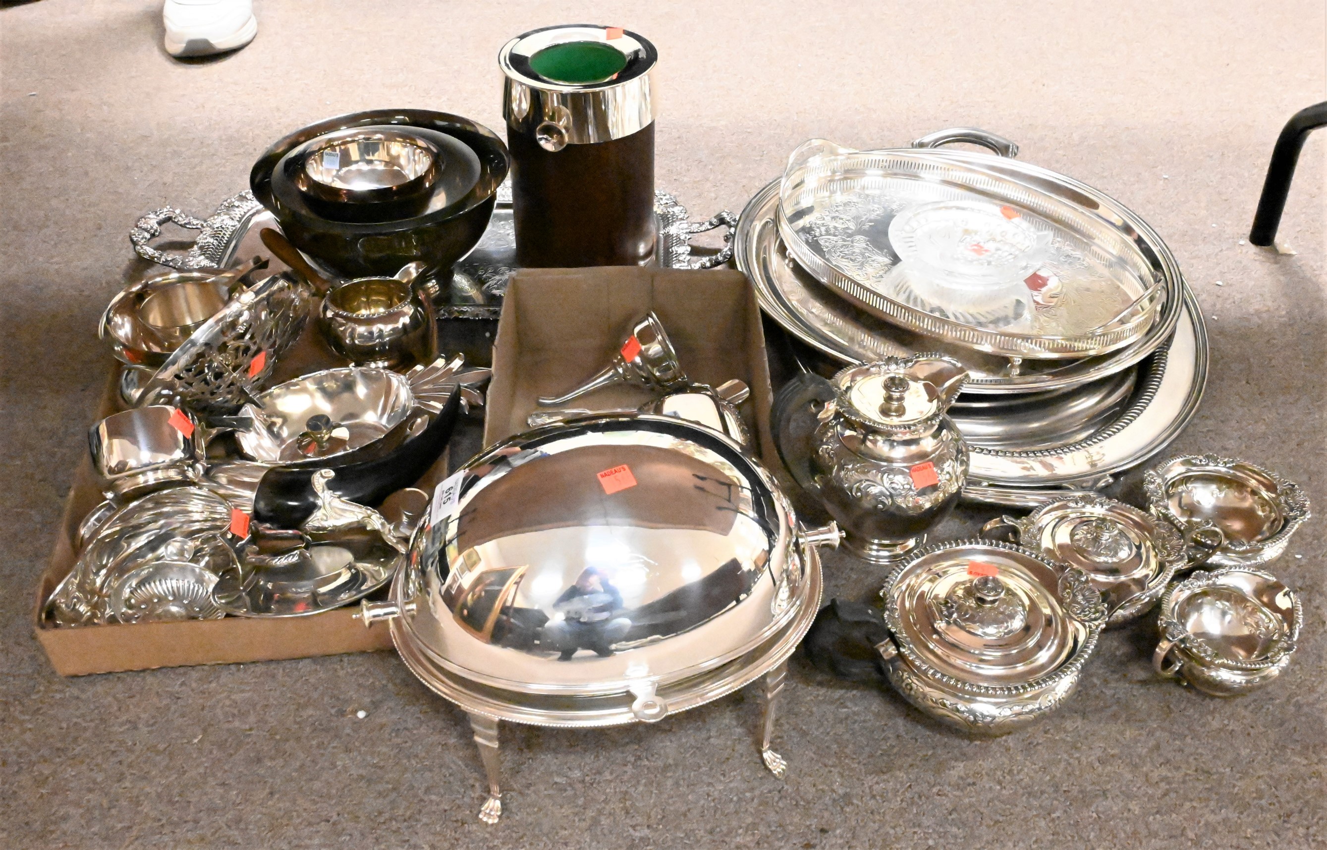 Large Lot of Silver Plate, to include large trays, a Lalique “Cancareau” ashtray, revere style bowls, horn, vase etc.., a five piece tea set, along with revolving tureen, small hand piece is off but available, height range 2 inches – 8 3/4 inches