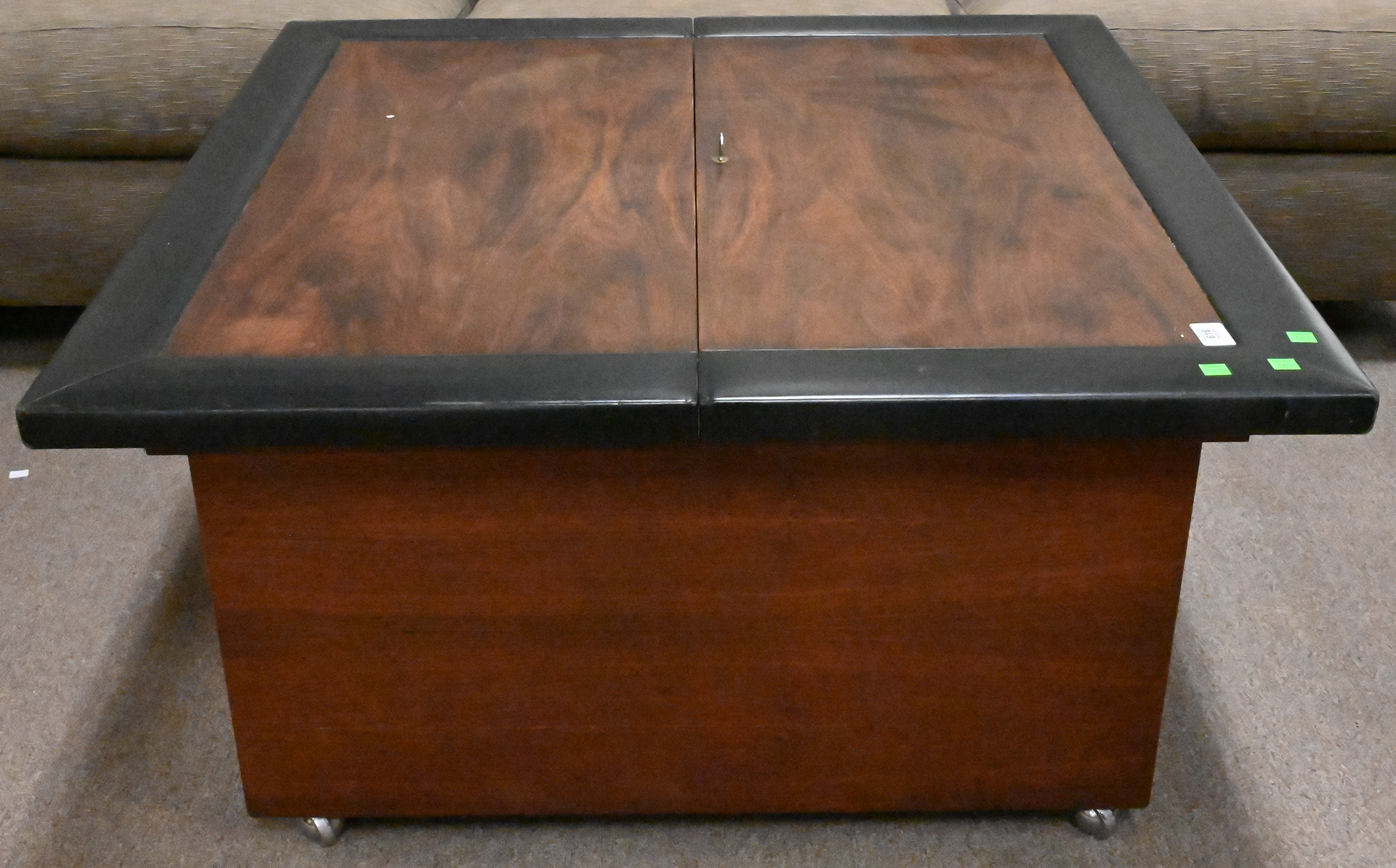 Mid Century Rosewood and Leather Wrapped Coffee Table, opening in center to cellarette style fitted interior having tin liner, set on casters, height 20 inches, top 39″ x 39″