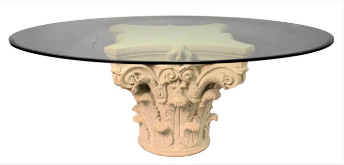 Molded Composition Capital Now Mounted as a Table, having oval plate glass top with beveled edge, on a base molded as a Corinthian column capital height 29 1/2 inches, top 59 1/2″ x 80″. Provenance Property from a private New York collection sold to benefit charitable foundations.