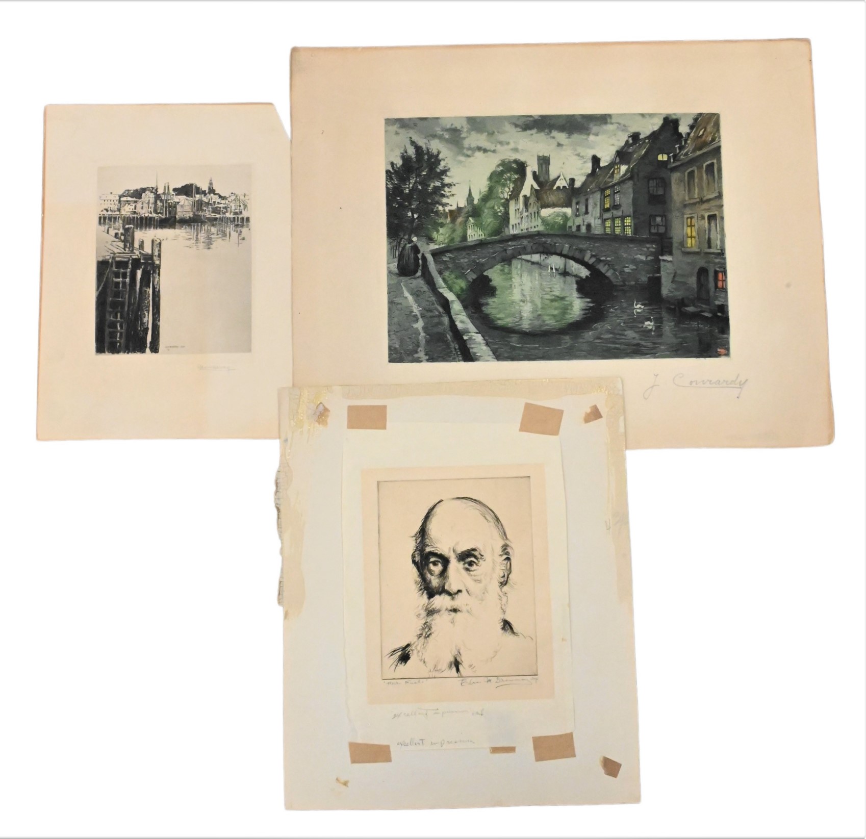 signed “J. Conrardy” lower right of street scene with a canal