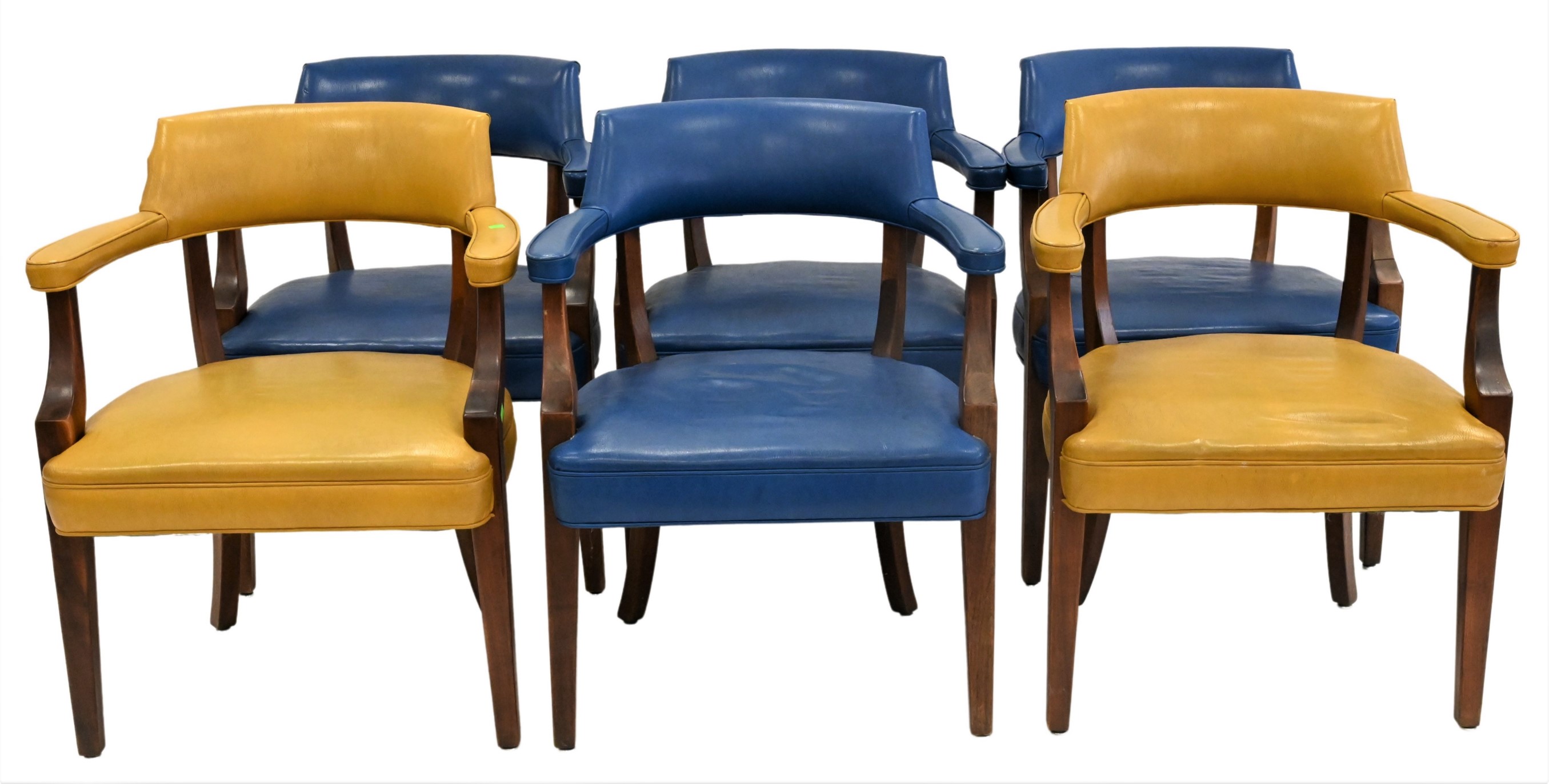 Set of Seven Mid. Century Arm Chairs, two colors, one with tear in top, one arm as is, one with broken leg, height 31 inches, width 24 1/2 inches, Provenance: Julius H Jacobson II a Fifth Avenue Estate.
