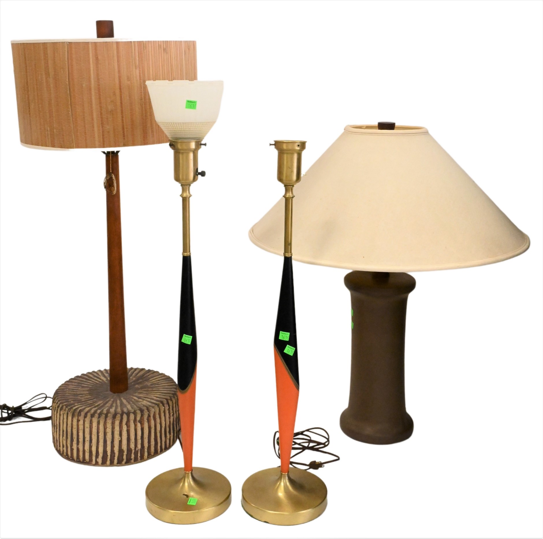 Four Table Lamps, to include a pair of Mid Century Table Lamps, orange and black in color, total height 34 inches, a Marshall Studios Pottery Table Lamp, signed at base, total height 30 inches, and a Mid Century Wood Table Lamp, total height 38 inches. (one missing glass shade)