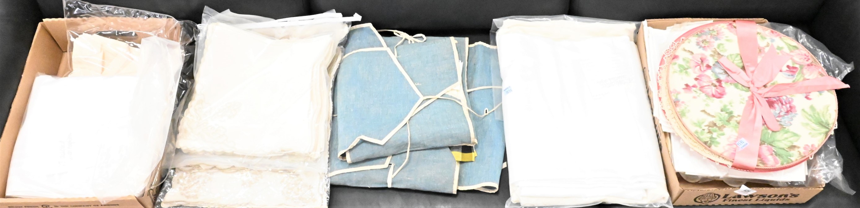 Quality Table Linens, to include set of 12 napkins, 22 matching embroidered napkins, 4 table cloths in assorted sizes, 15 embroidered napkins, 8 embroidered placemats, 8 matching napkins, lace table cover, dollies and more.