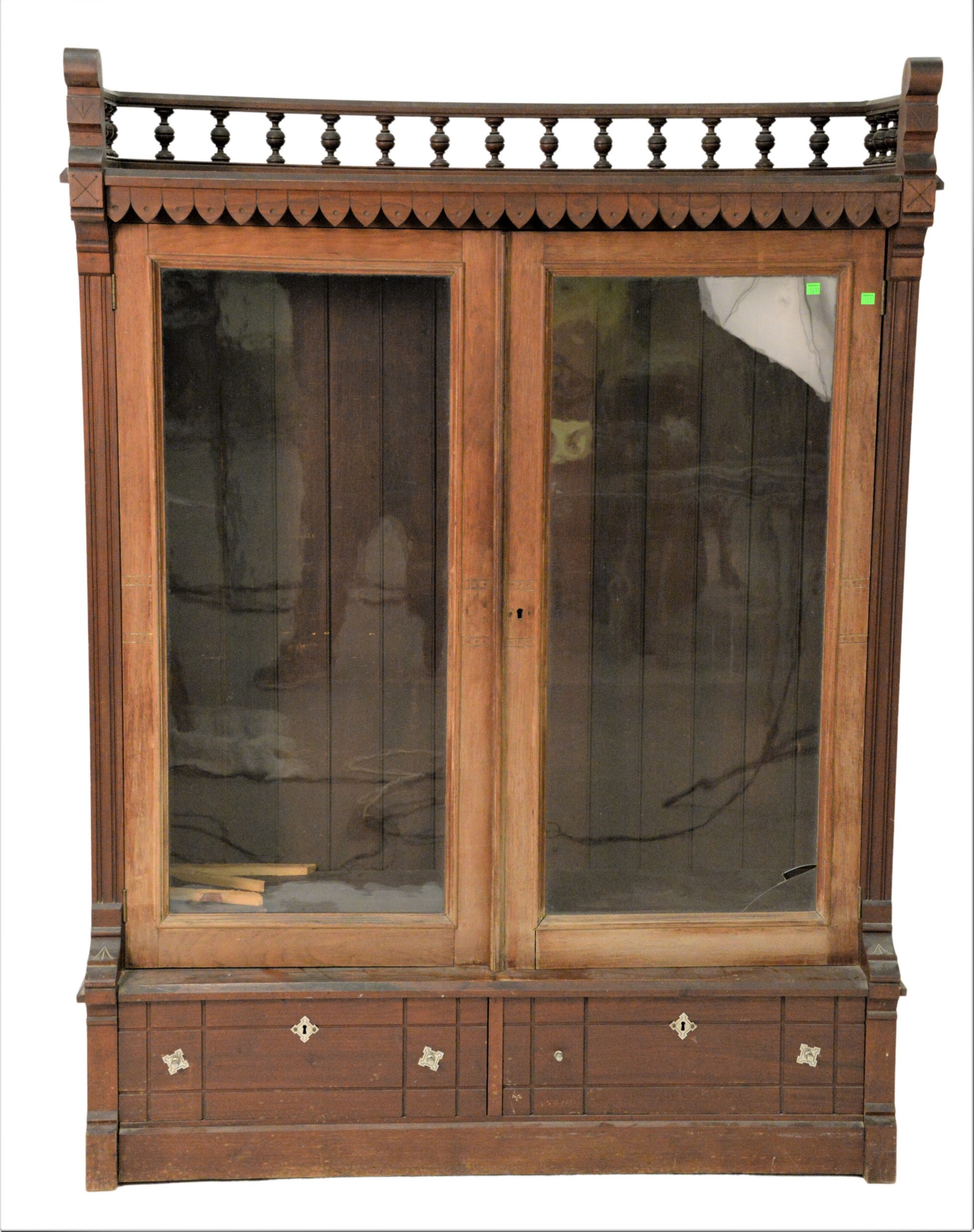 Victorian Walnut Bookcase, having doors, gallery, three shelves, and two drawers. ( one glass as is) (worn and faded). height 65 1/2 inches, width 50 inches