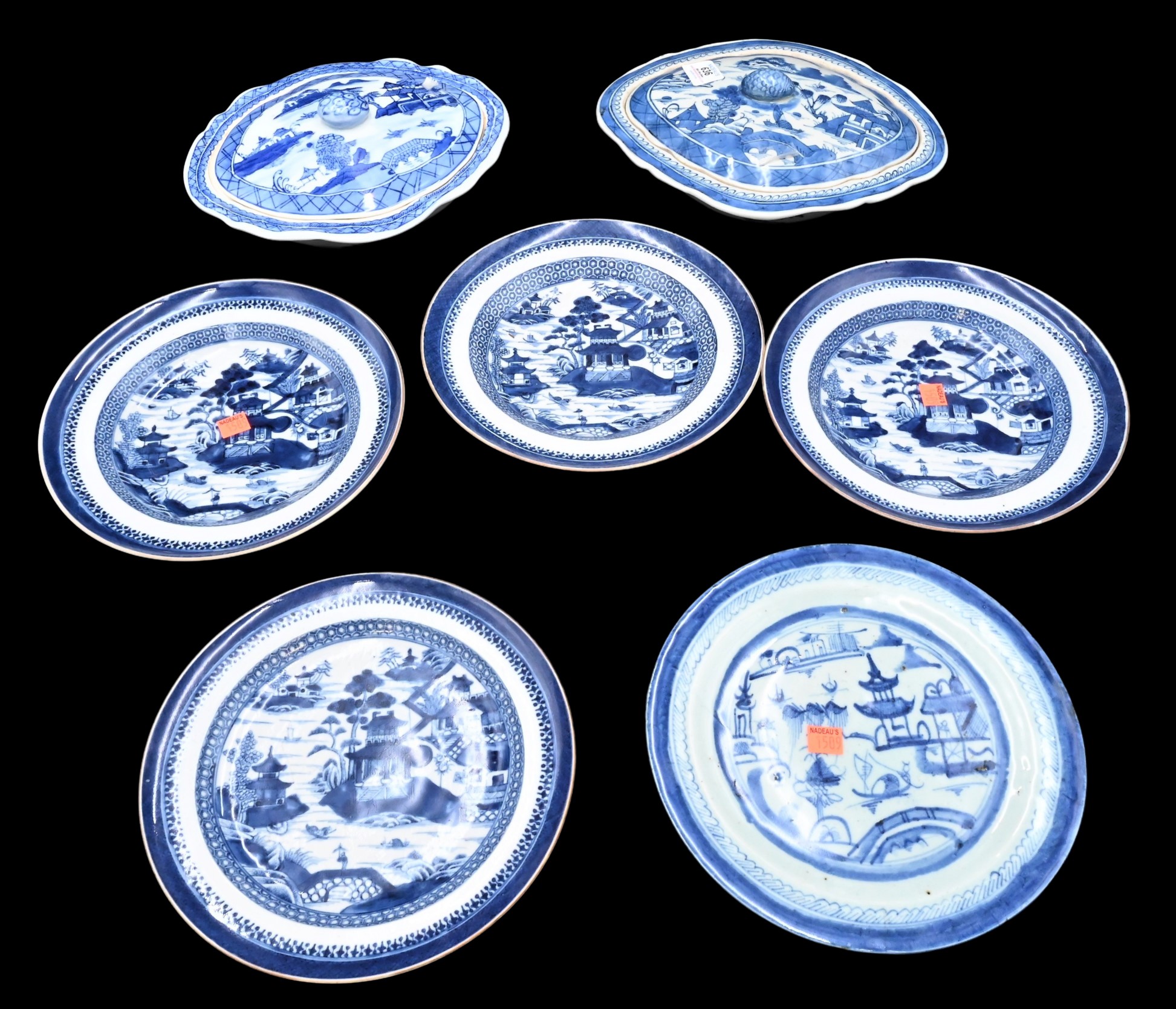 Seven Piece Lot, to include four Nat King export shallow bowls, one Canton plate, align with two Canton covered vegetable dishes, largest in diameter 11 1/4 inches.
