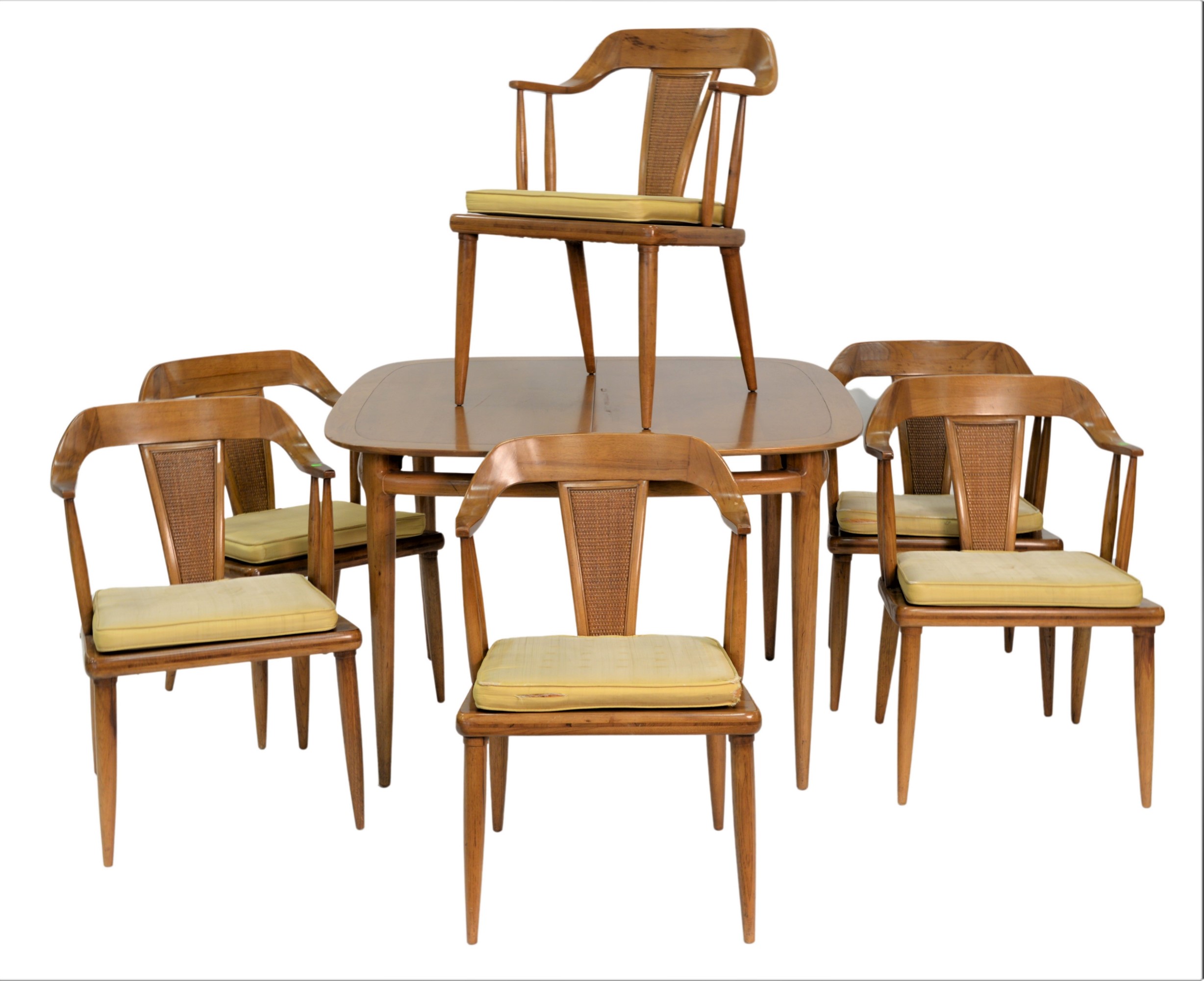 Seven Piece Tomlin “Sophisticate” Dining Set, to include six chairs, table, two leaves (18 inches) and sideboard, height 29 inches, Top 44 inches x 44 inches, Top Open 44 inches x 80 inches