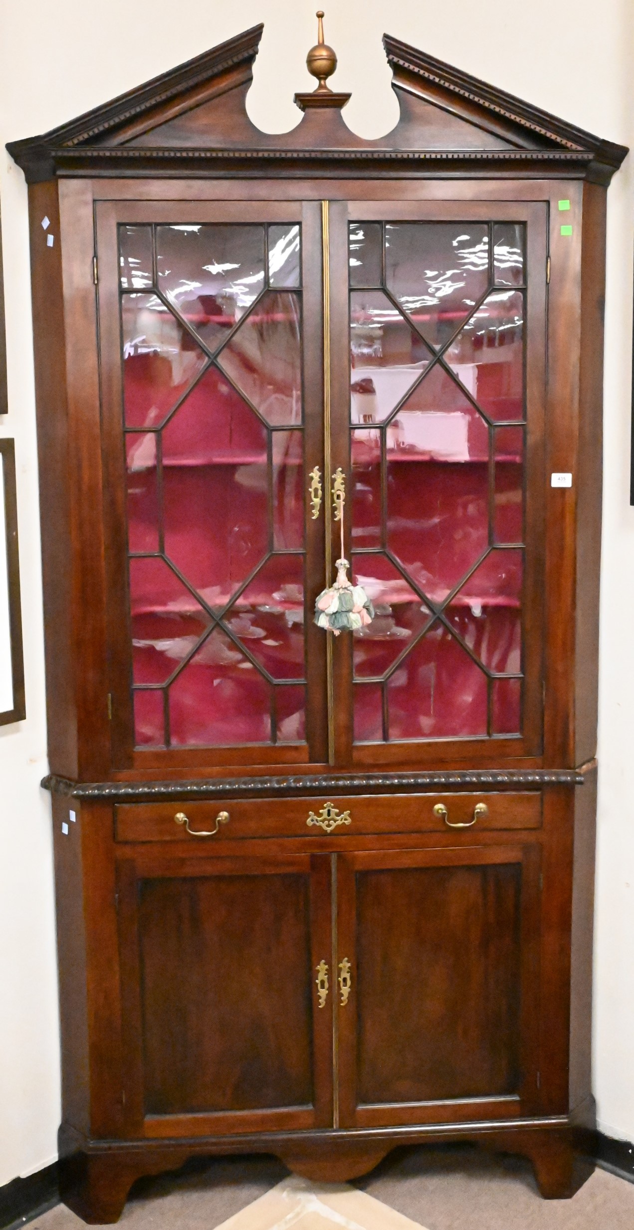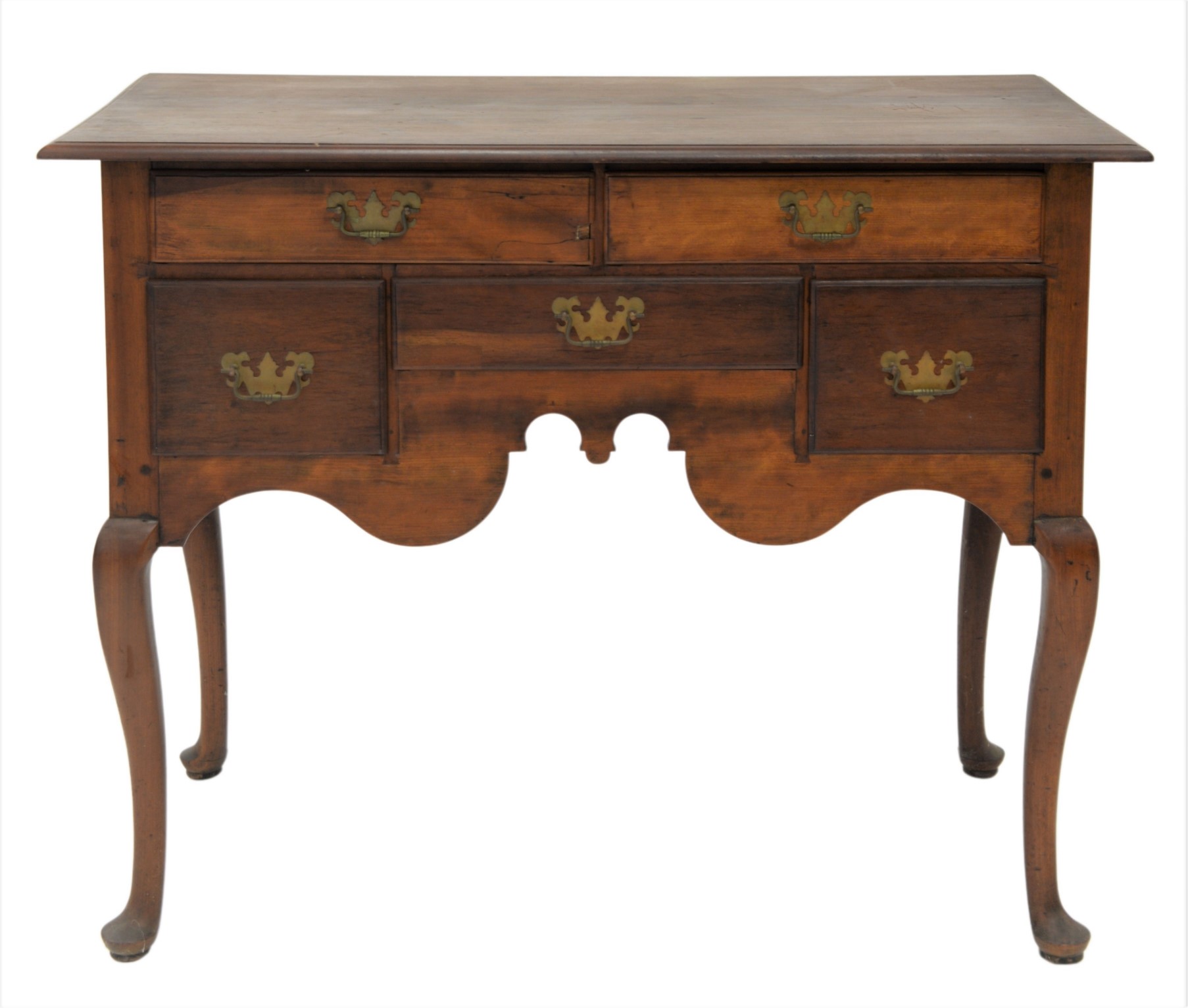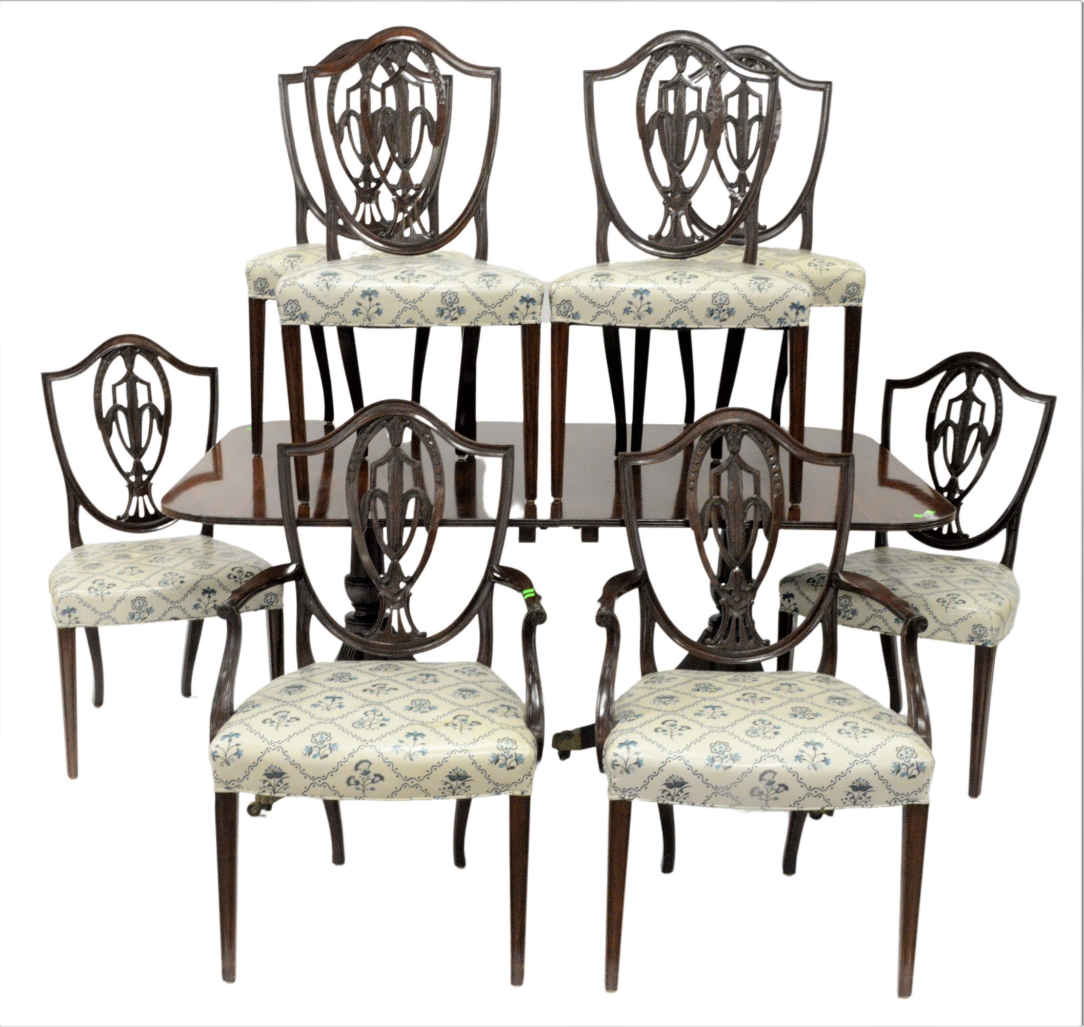 Nine Piece George III Style Dining Set, to include double pedestal dining table with gadrooned edge, eight shield back chairs, two arm, six side, two leaves with lengths of 21 1/2 inches, height 29 1/2 inches, length 66 1/2 inches without leaves, top 47 1/2″ x 66 1/2″