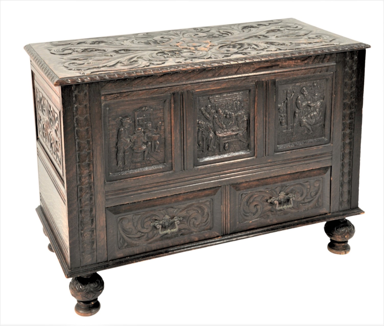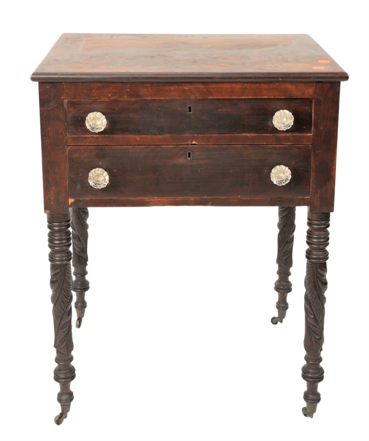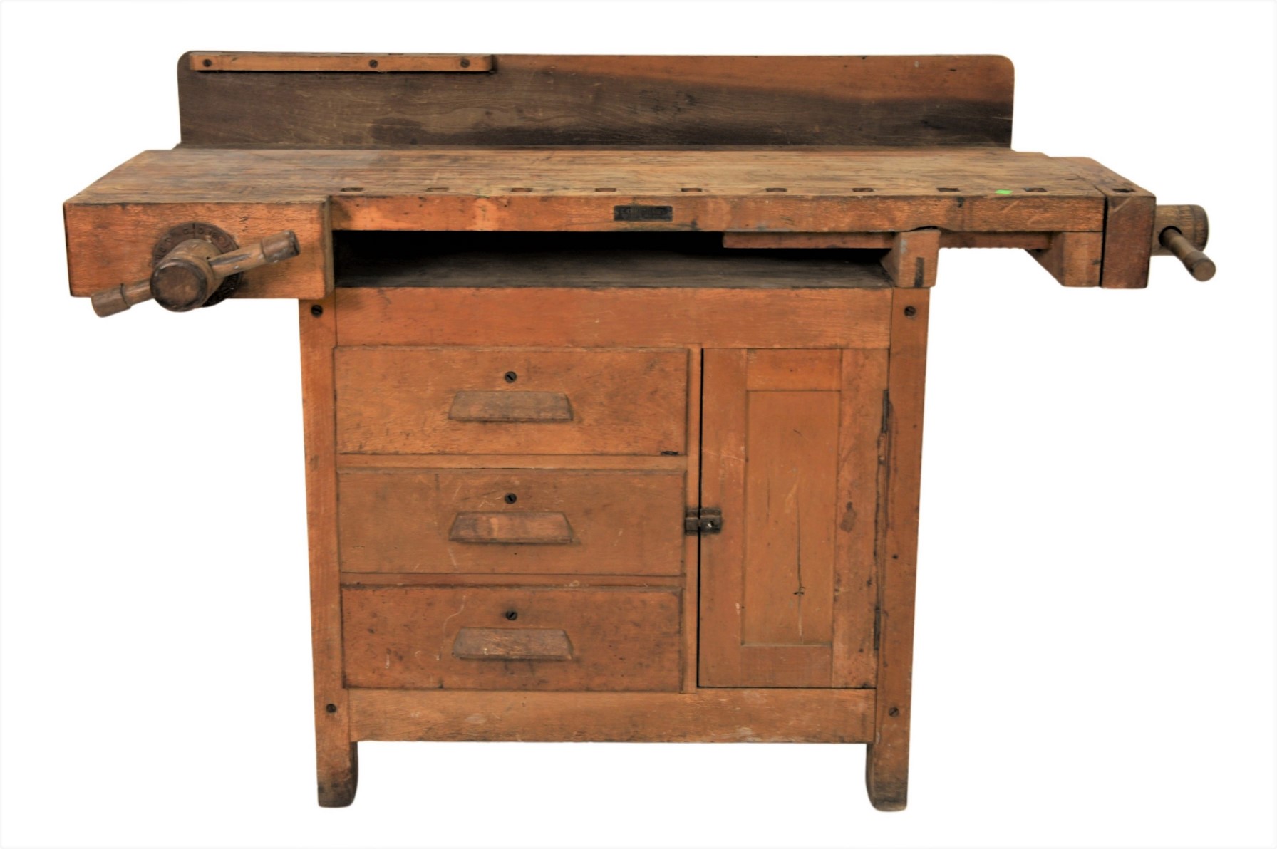 C. Christiansen Chicago Woodworkers Workbench, in two parts, having two vises on base with cabinet and door, along with three drawers, height 32 inches, length without vises 48 inches, Provenance: Estate of Donald K. Huber