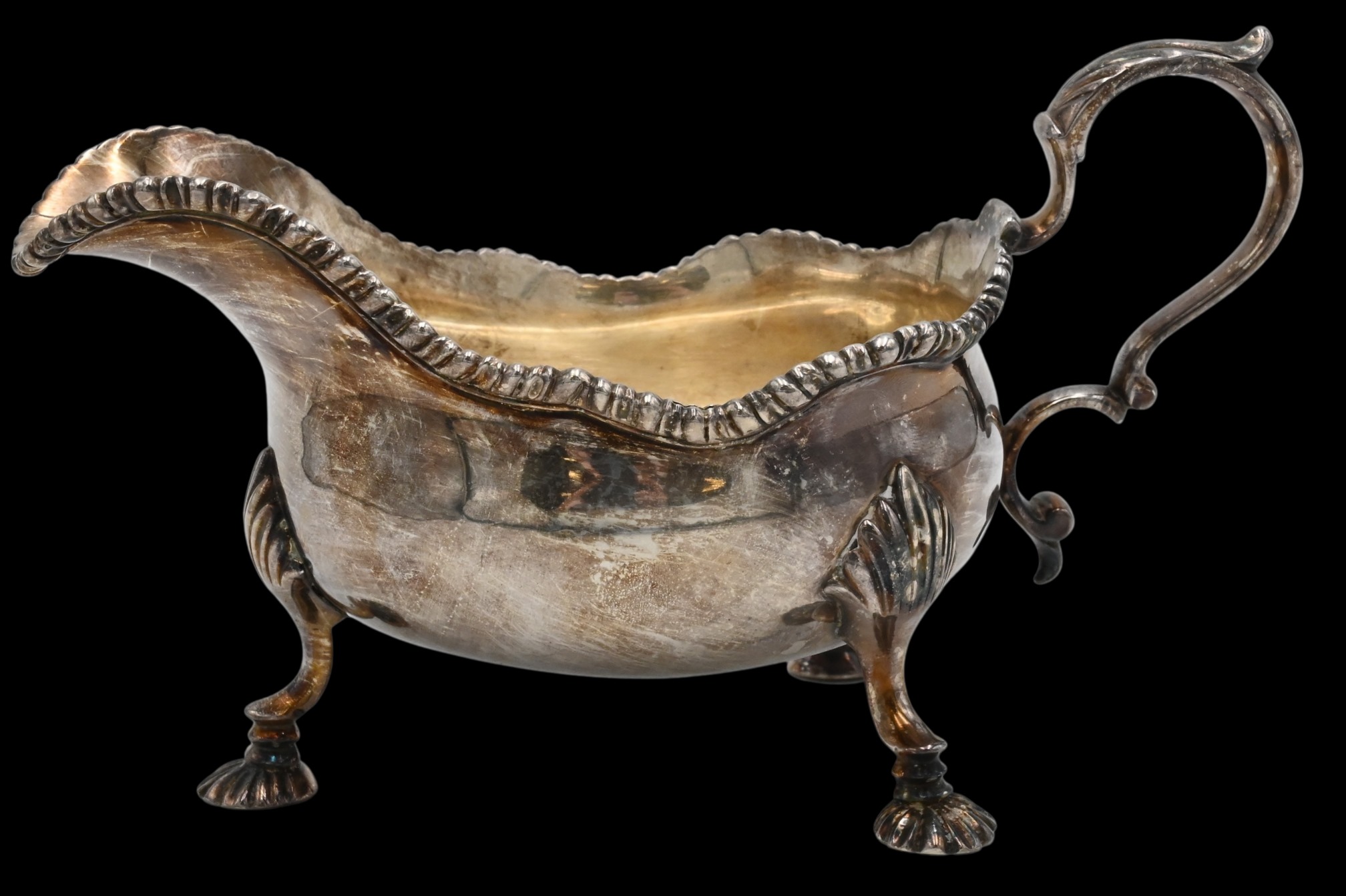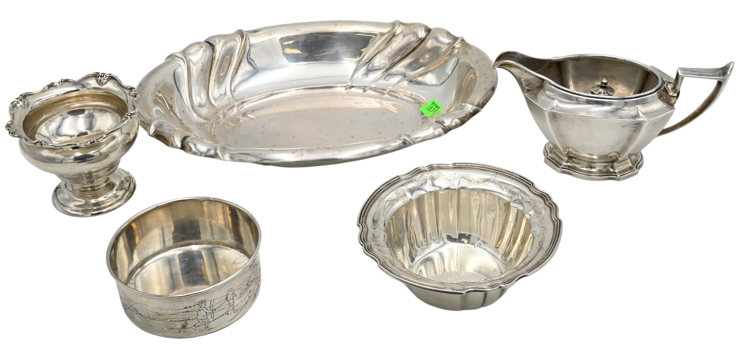 Five Piece Silver Lot, to include two pieces of continental silver, sterling silver teapot, childs dish, etc.. tallest height 3 inches, largest diameter 12 1/2 inches. 52.6 t.oz.