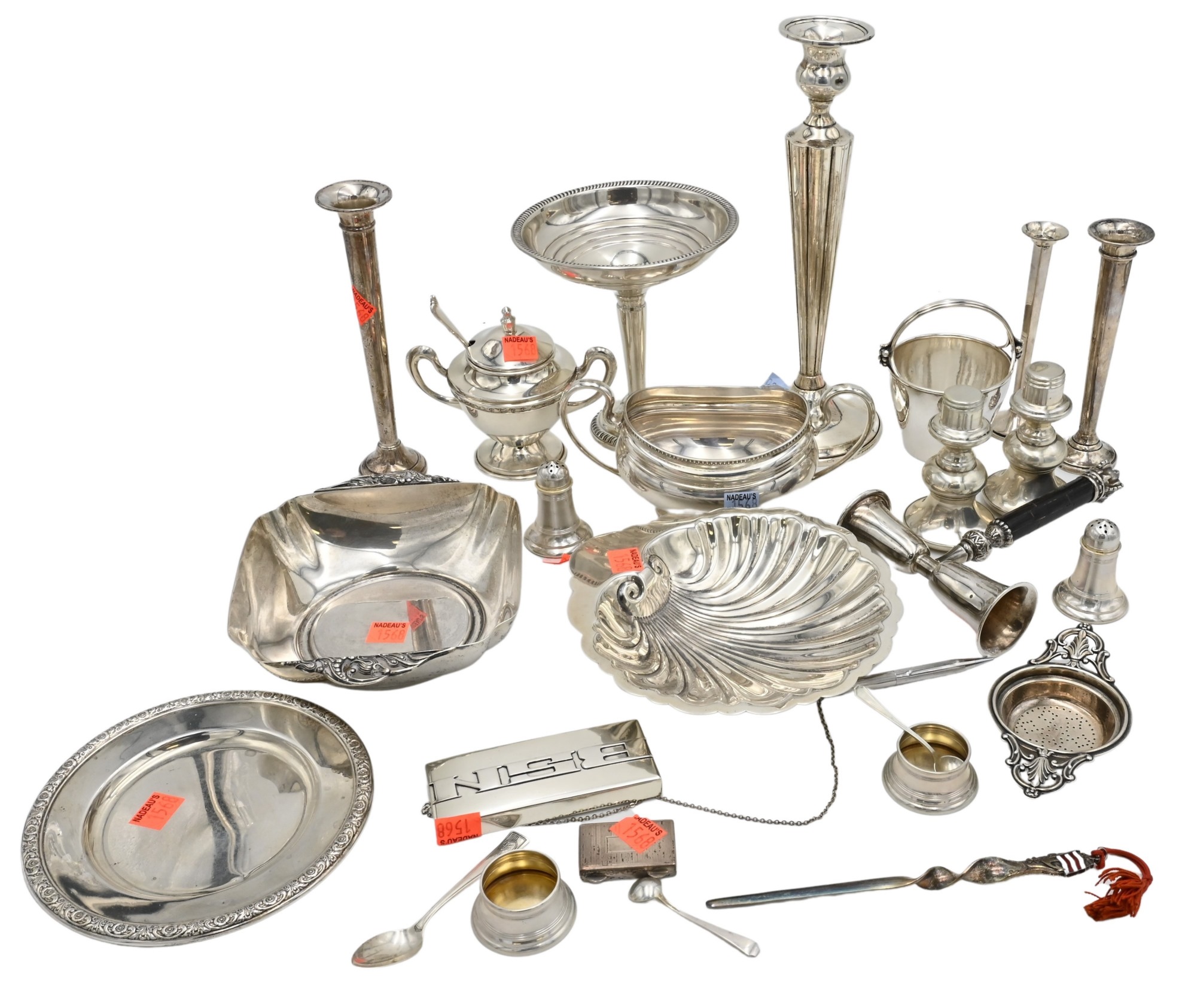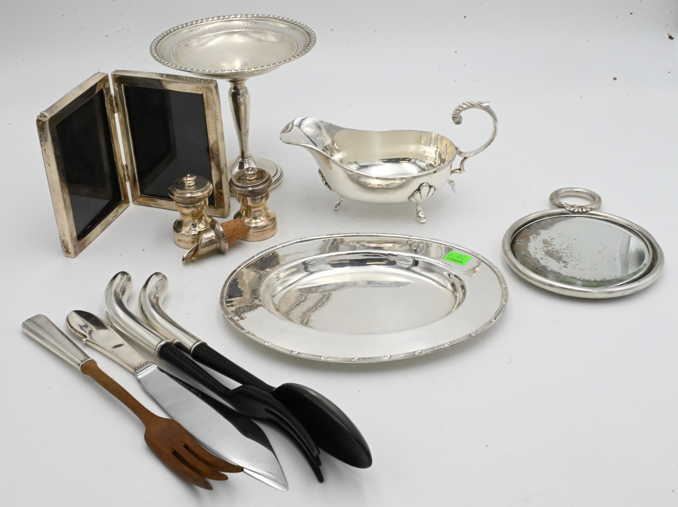 Tray Lot of Sterling Silver, with Danish small buckert, salts, shell dish, strainer covered superbowl, square dish and open sugar, plus weighted silver. tallest height 10 inches, 45.5 t.oz., plus weighted.