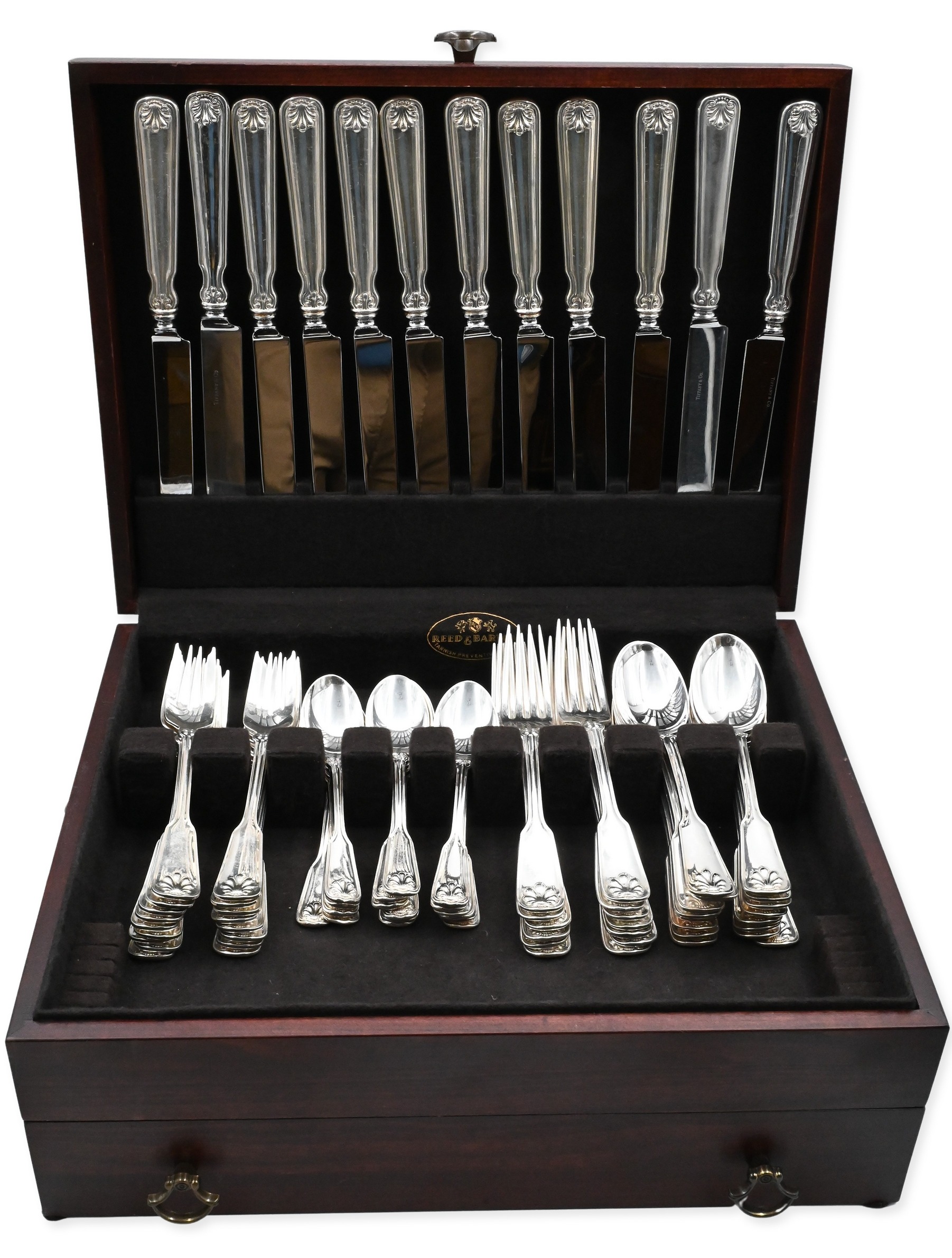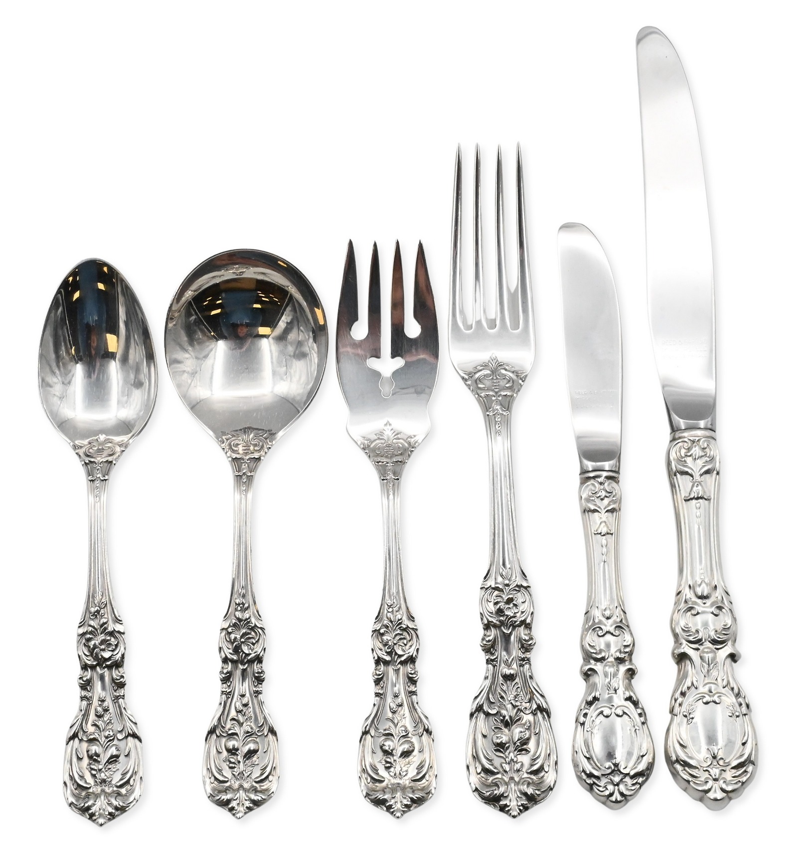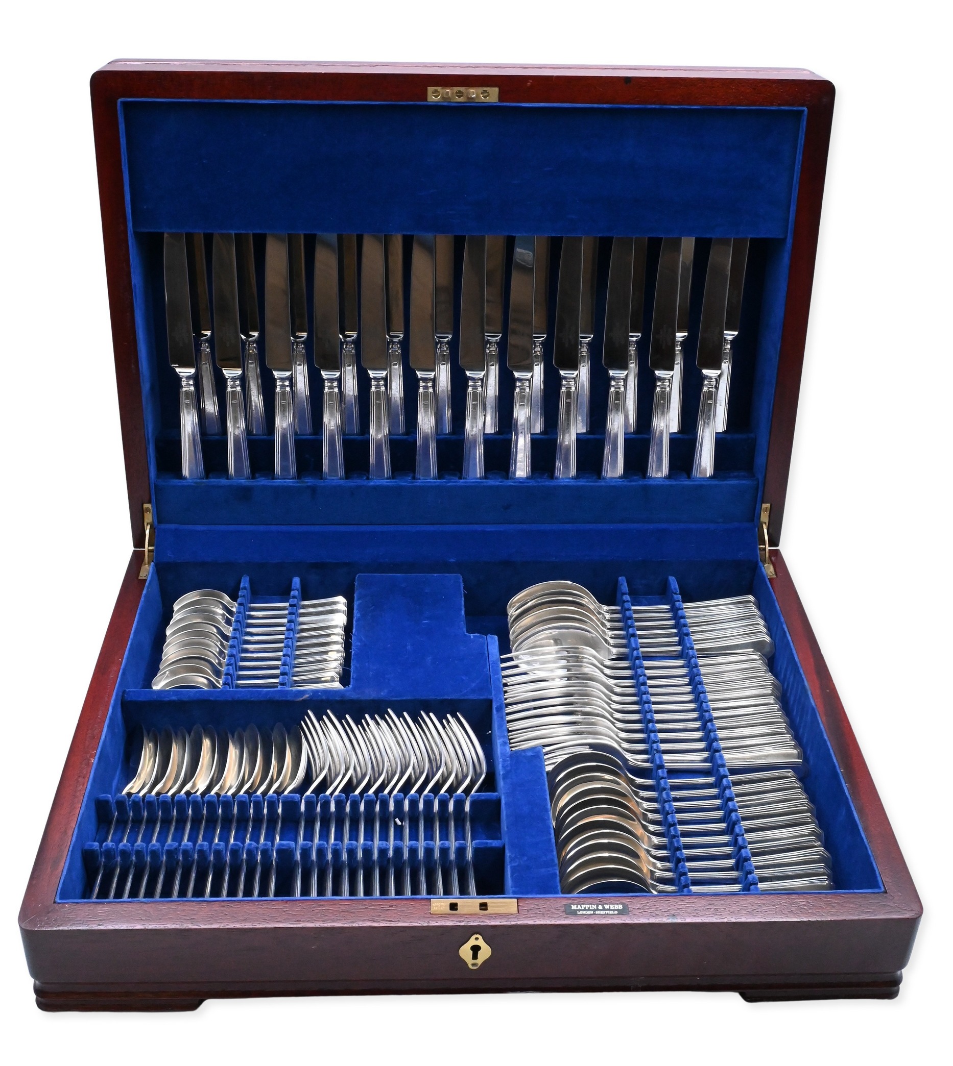 to include 12 dinner forks, 12 luncheon forks, 12 salad, 12 fish forks, 12 cocktail forks, 12 dessert forks, 12 ice cream forks/spoons, 6 place spoons, 12 tablespoons, 12 soup spoons, 12 bouillon spoons, 24 teaspoons, 12 ice tea spoons, 12 demi spoons, 12 sherbet spoons, 12 dinner knives, 12 luncheon knives, 12, weighted butter knives, 12 solid butter knives (7 inches), 12 solid butter knives (5 3/4 inches), 16 serving pieces, 2 pie servers, 1 knife sharpener, 2 carving forks, and 2 carving knives, to include custom wooden fitted box