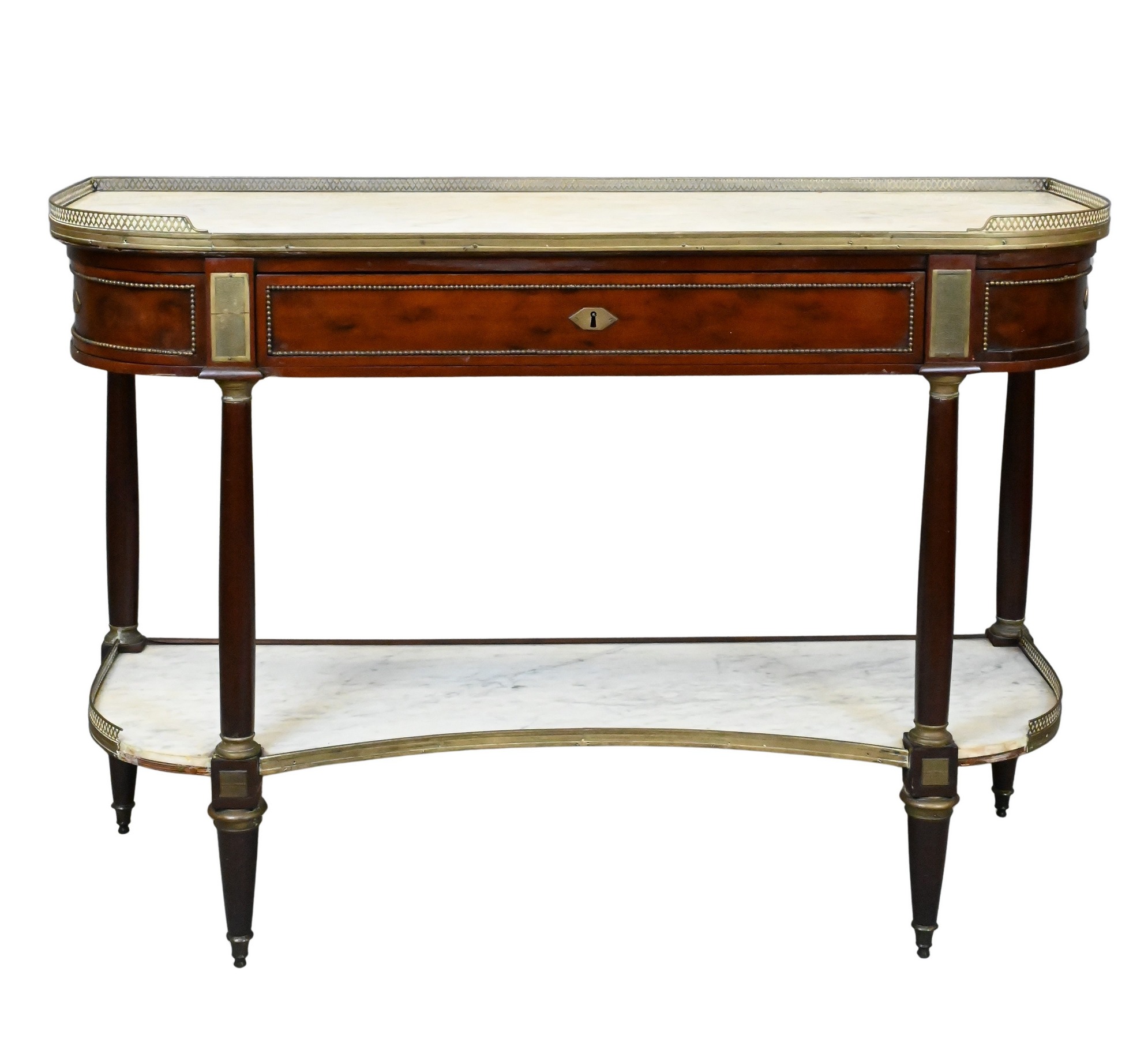 Rectangular tan-colored marble or granite top above two frieze drawers and two long drawers finely mounted with gilt-bronze inlay, including diamond-patterned ornament, rosette and beaded mounts, and fluted corner stiles; raised on tapered legs ending in gilt-bronze sabots. The reverse bearing a chalk inscription “A D Room.” A refined example of late 18th-century Parisian cabinetry, consistent with the elegant neoclassical forms, mahogany veneers, and high-quality ormolu mounts associated with Saunier’s workshop and with furniture produced for leading marchands-merciers such as Dominique Daguerre