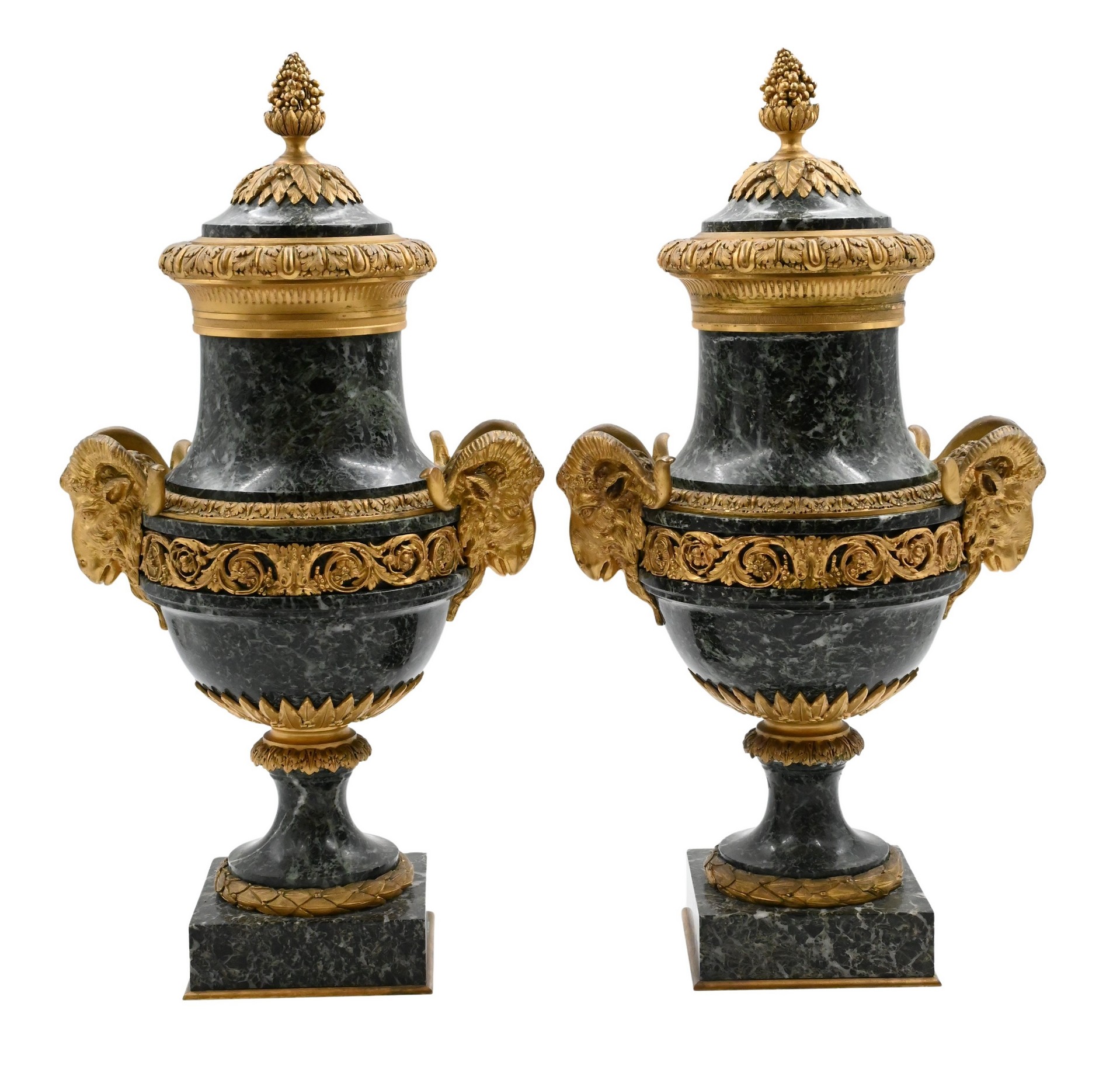 each urn finely carved in deep verde marble, surmounted by a gilt-bronze acorn finial and domed lid with stiff-leaf and beaded borders, the shoulders mounted with bold gilt-bronze ram’s-head masks issuing scrolling foliate handles, above a frieze of laurel and rosette decoration, the bodies rise on a waisted marble socle with gilt laurel wreath mounts, set on stepped square verde marble bases with gilt edging