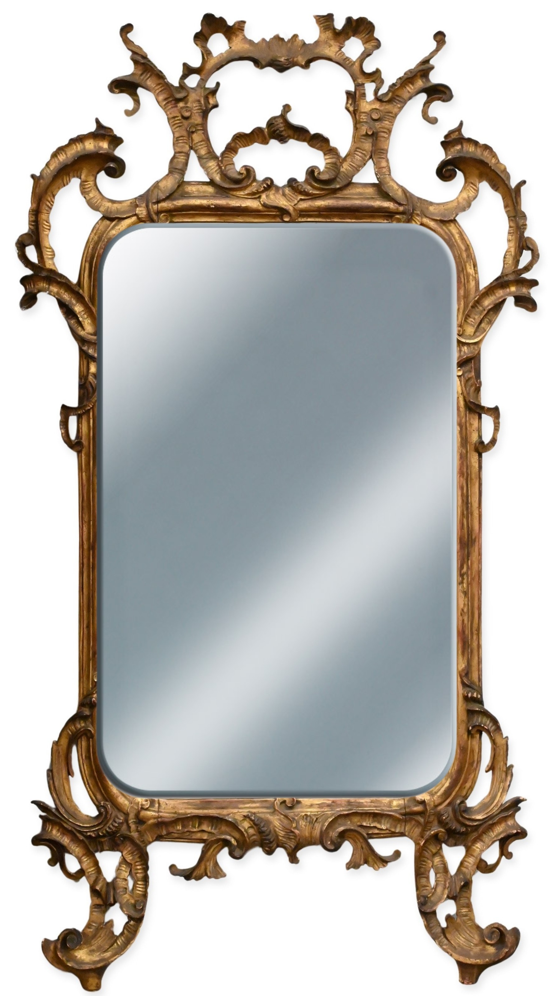 carved giltwood frame with scrolls, leafage, and pierced crest, original mirror plate with expected age spotting, early 20th century