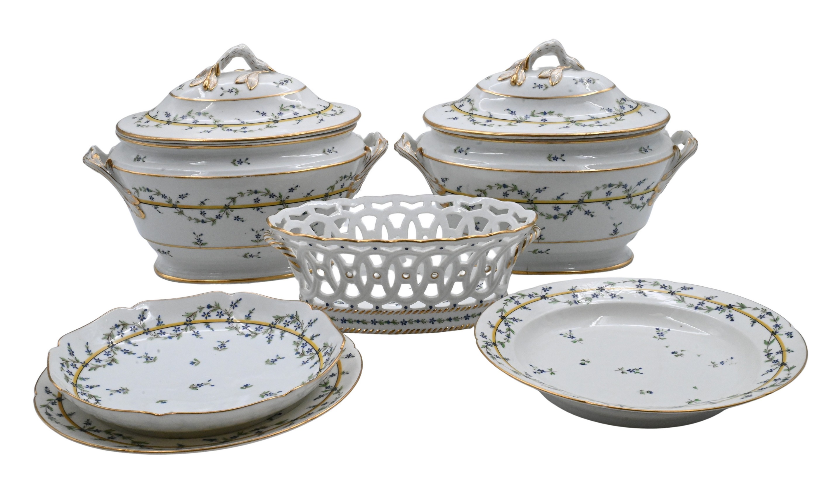 10 dinner plates, 13 salad bowls, 17 soup bowls, 8 oval serving dishes, 2 square serving dishes (8 3/4 × 9 inches), 6 round trays (including three circular serving dishes, 13 inches diameter, a large perforated platter…), 2 gravy boats, 2 gravy boat underplates, 3 reticulated baskets, 2 covered tureens (13 inches wide over handles), and one lid