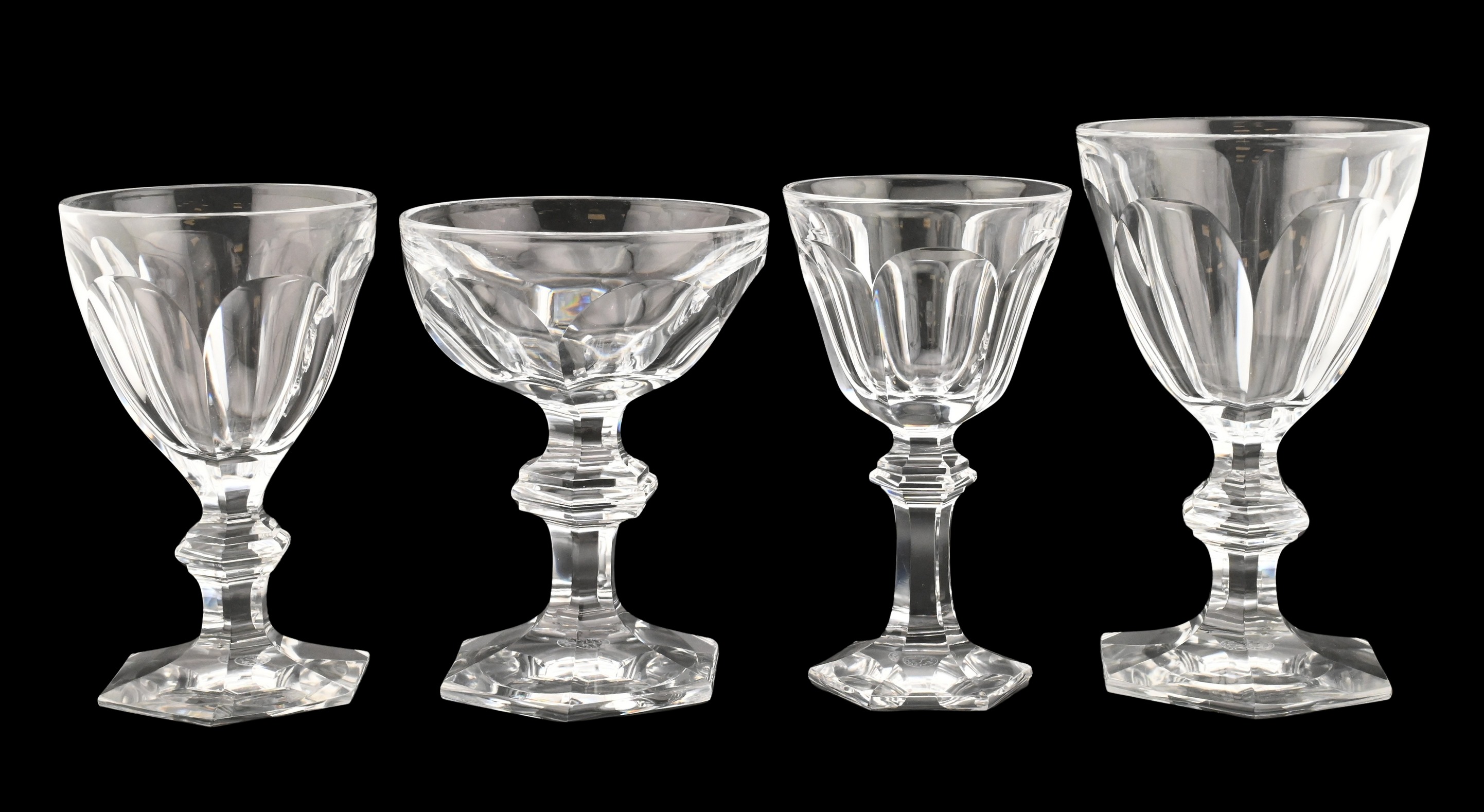 each crystal footed coupes, each with a paneled bowl rising from a faceted hexagonal foot, the bases acid-etched with the Baccarat France circular trademark, set for 12 to include: 12 (6 inch) water goblets, 12 (5 3/4 inch) red wine, 12 (5 1/8 inch) stems, 12 champagne chalice (5 inch)