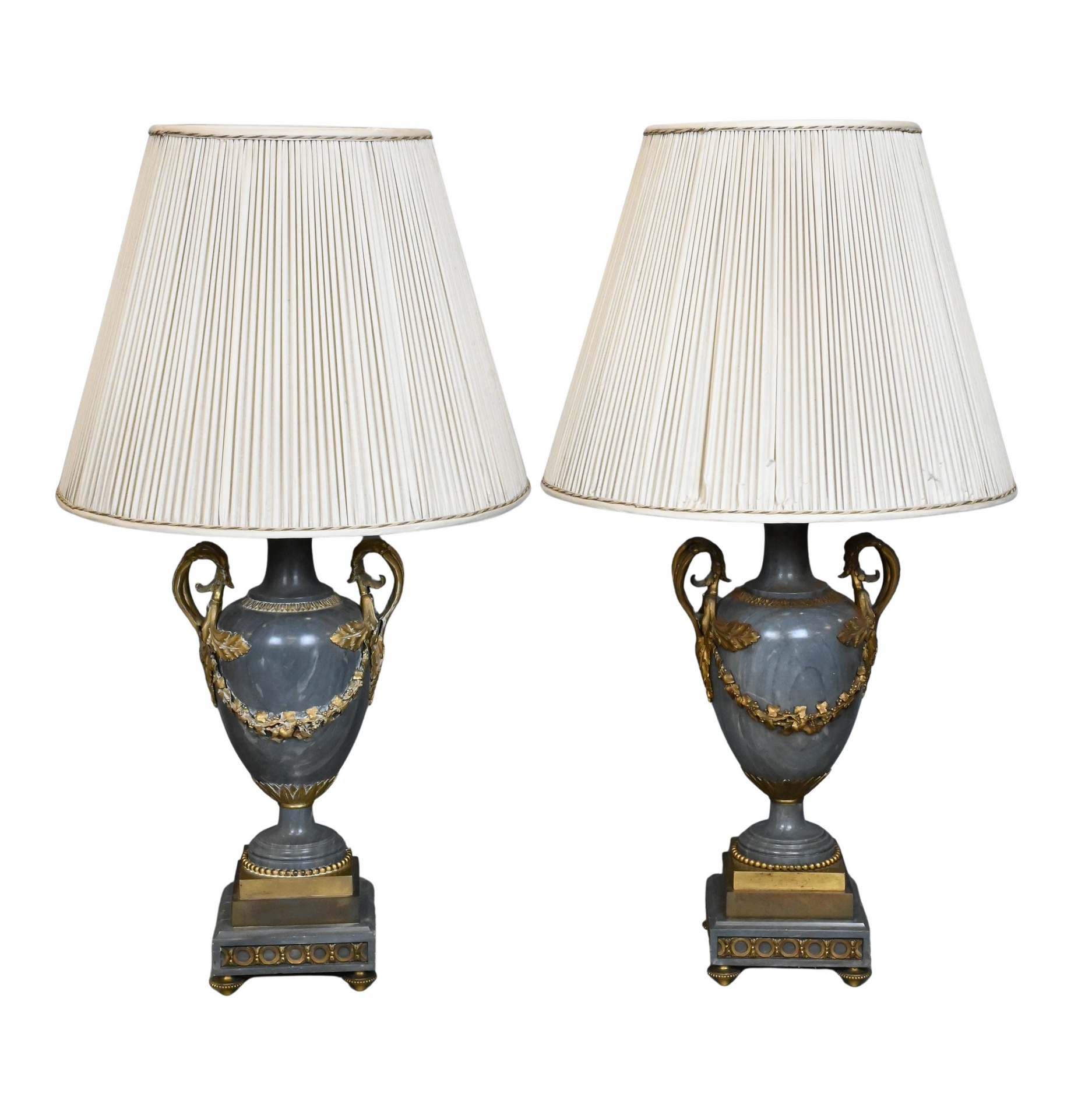 elegant pair of neoclassical urn-form lamps carved in gray marble, each fitted with gilt-bronze acanthus-scroll handles and applied laurel-leaf swags, mounted on stepped gilt-bronze bases with beaded borders and classical ornament, later electrified and fitted with pleated shades